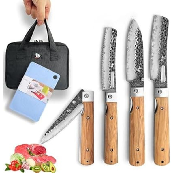 SENBON 440 Forged Stainless Steel Portable Kitchen Knife, Foldable Chef's Knife, Fruit Knife, 4-Piece Set with Olive Wood Handle