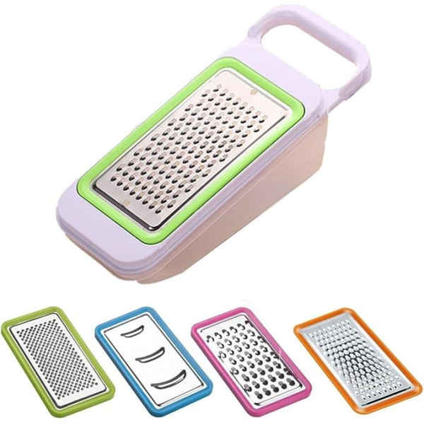 MULTIFUNCTIONAL TOOL This versatile box grater combines multiple functions in one compact device, including a cheese grater with container, a vegetable grater and a potato chopper, ideal for various kitchen tasks. Convenient Storage The vegetable grater has a built in container that collects grated ingredients, ensuring easy storage and less mess. This convenient design will keep your kitchen organized and your countertops clean. STURDY & DURABLE Made of high quality stainless steel, this cheese grater with container is sturdy and resistant to rust, providing a durable solution for all your grating needs. EFFICIENT FOOD PREPARATION With different blade options, this vegetable slicer speeds up food preparation, allowing you to quickly cut, crush or grate vegetables and cheese, saving time when preparing meals. EASY TO CLEAN The graters for kitchen are designed for hassle free cleaning. The removable parts and smooth surface make washing and maintenance easier and ensure a clean and hygienic cooking environment. › See more product details; Product description Special features: Versatile grating options: Our vegetable grater contains four interchangeable stainless steel blades, so you can choose between coarse chopping, fine grating, slicing and mashing. This flexibility makes it ideal for a variety of food preparation tasks. Practical: The mini grater features a compact and ergonomic design that fits comfortably in the hand and can be easily stored in your kitchen drawer. Its small size does not compromise on functionality, making it perfect for everyday use. Efficient: with its cheese grater rotating function, this tool provides smooth and effortless grating. The non-slip base ensures stability during use, prevents slipping and ensures safe operation. Technical data: Material: stainless steel. Color: Green, Rose Red, Orange, Blue Package includes: 4 x Stainless Steel Blades 1 x Container with Lid; Product description Special features: Versatile grating options: Our vegetable grater contains four interchangeable stainless steel blades, so you can choose between coarse chopping, fine grating, slicing and mashing. This flexibility makes it ideal for a variety of food preparation tasks. Practical: The mini grater features a compact and ergonomic design that fits comfortably in the hand and can be easily stored in your kitchen drawer. Its small size does not compromise on functionality, making it perfect for everyday use. Efficient: with its cheese grater rotating function, this tool provides smooth and effortless grating. The non-slip base ensures stability during use, prevents slipping and ensures safe operation. Technical data: Material: stainless steel. Color: Green, Rose Red, Orange, Blue Package includes: 4 x Stainless Steel Blades 1 x Container with Lid; Special features: Versatile grating options: Our vegetable grater contains four interchangeable stainless steel blades, so you can choose between coarse chopping, fine grating, slicing and mashing. This flexibility makes it ideal for a variety of food preparation tasks. Practical: The mini grater features a compact and ergonomic design that fits comfortably in the hand and can be easily stored in your kitchen drawer. Its small size does not compromise on functionality, making it perfect for everyday use. Efficient: with its cheese grater rotating function, this tool provides smooth and effortless grating. The non-slip base ensures stability during use, prevents slipping and ensures safe operation. Technical data: Material: stainless steel. Color: Green, Rose Red, Orange, Blue Package includes: 4 x Stainless Steel Blades 1 x Container with Lid
