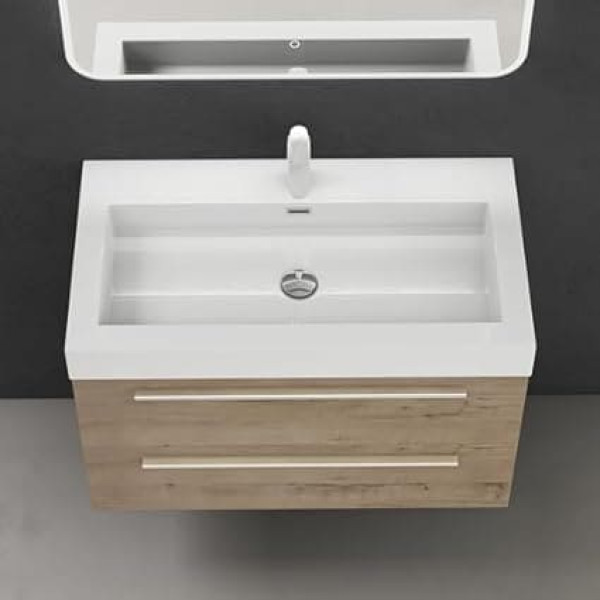 Designer bathroom furniture set consisting of sink 1 tap hole, base cabinet and LED bathroom mirror. Wall-mounted base cabinet: WTH: 73 x 48 x 60 cm; colour: Greige oak | cast mineral sink: width: 73 cm; colour: white | LED bathroom mirror: 80 x 60 cm. Wood type: paint-free panels of emission class E1 | moisture resistant surface of the cabinet | drawers with soft-close function 2 drawers with plenty of storage space: you can store towels, cosmetics and hygiene items in a space-saving and clear manner. Copper-free LED bathroom mirror with dimming function; after the mirror light has been turned on for a moment, the built-in heater is automatically activated. › See more product details; Product description Design square bathroom furniture set. Basin: (W x D x H): 73 x 48 x 10 cm. Base cabinet: (W x D x H): 73 x 48 x 60 cm. LED bathroom mirror: (W x D): 60 x 80 cm. Wood type: varnish-free panels of the E1 emission class. The surface of the cabinet has a pleasant feel and is moisture resistant. Sink material: mineral cast from one piece. Ready to assemble. Quality product. LED bathroom mirror with dimming function. Easy to install. Elegant bathroom set - visually an absolute highlight. The Quadratto bathroom furniture set has an elegant design, which integrates wonderfully into your bathroom. The cabinets are ready to assemble, so you don't need to assemble anything. The furniture is made from robust high-quality panels. The melamine coating makes the bathroom furniture set waterproof. The included sink is made of mineral cast and comes without fittings. Note: This item is shipped via a freight forwarder, for this reason we ask you to enter your telephone number when ordering in order to be able to arrange a delivery date. Self-pickup desired? - No problem. Order and pay for this item conveniently via Amazon and pick up the item from us in the warehouse by appointment. Call us after ordering via Amazon and schedule a pickup appointment. Simple, convenient and enjoy all the benefits of Amazon.; Product description Design square bathroom furniture set. Basin: (W x D x H): 73 x 48 x 10 cm. Base cabinet: (W x D x H): 73 x 48 x 60 cm. LED bathroom mirror: (W x D): 60 x 80 cm. Wood type: varnish-free panels of the E1 emission class. The surface of the cabinet has a pleasant feel and is moisture resistant. Sink material: mineral cast from one piece. Ready to assemble. Quality product. LED bathroom mirror with dimming function. Easy to install. Elegant bathroom set - visually an absolute highlight. The Quadratto bathroom furniture set has an elegant design, which integrates wonderfully into your bathroom. The cabinets are ready to assemble, so you don't need to assemble anything. The furniture is made from robust high-quality panels. The melamine coating makes the bathroom furniture set waterproof. The included sink is made of mineral cast and comes without fittings. Note: This item is shipped via a freight forwarder, for this reason we ask you to enter your telephone number when ordering in order to be able to arrange a delivery date. Self-pickup desired? - No problem. Order and pay for this item conveniently via Amazon and pick up the item from us in the warehouse by appointment. Call us after ordering via Amazon and schedule a pickup appointment. Simple, convenient and enjoy all the benefits of Amazon.; Design square bathroom furniture set. Basin: (W x D x H): 73 x 48 x 10 cm. Base cabinet: (W x D x H): 73 x 48 x 60 cm. LED bathroom mirror: (W x D): 60 x 80 cm. Wood type: varnish-free panels of the E1 emission class. The surface of the cabinet has a pleasant feel and is moisture resistant. Sink material: mineral cast from one piece. Ready to assemble. Quality product. LED bathroom mirror with dimming function. Easy to install. Elegant bathroom set - visually an absolute highlight. The Quadratto bathroom furniture set has an elegant design, which integrates wonderfully into your bathroom. The cabinets are ready to assemble, so you don't need to assemble anything. The furniture is made from robust high-quality panels. The melamine coating makes the bathroom furniture set waterproof. The included sink is made of mineral cast and comes without fittings. Note: This item is shipped via a freight forwarder, for this reason we ask you to enter your telephone number when ordering in order to be able to arrange a delivery date. Self-pickup desired? - No problem. Order and pay for this item conveniently via Amazon and pick up the item from us in the warehouse by appointment. Call us after ordering via Amazon and schedule a pickup appointment. Simple, convenient and enjoy all the benefits of Amazon.