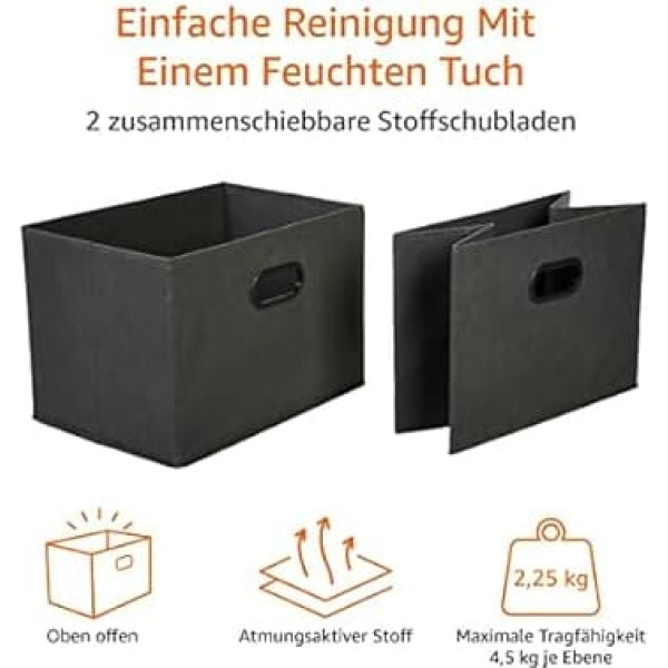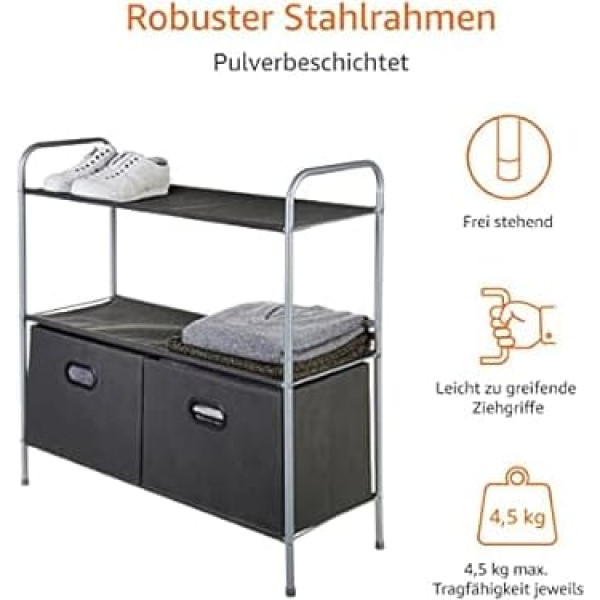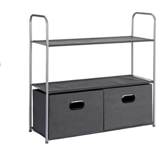 Extra space: free-standing organiser with 3 fabric shelves (load capacity 4.5 kg each) and 2 sliding open top fabric drawers (load capacity 2.25 kg each) HEAVY DUTY: Organizer storage system with powder coated metal frame and metal struts for increased stability MADE FROM BREATHABLE FABRIC Three tier comprehensive wardrobe organizer made of breathable dark gray fabric to keep stored clothes smelling fresh EASY ASSEMBLY This clothes and shoes storage system comes with installation instructions MULTIPURPOSE Ideal for use as a shelving system, basement shelf, coat rack with shelf, organizer wardrobe or drawer dresser in kitchen, bathroom, living room or hallway Dimensions and weight: drawer cabinet with the dimensions ‎83 x 31 x 78.7 cm (L x W x H) and light weight: only 3 kg › See more product details