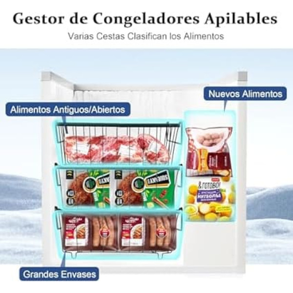 Ordered sorting of the freezer: Multiple frozen fabric containers can classify and organise different meat, fish, packaged vegetables and ice cream, so that nothing is lost on the bottom. Stackable storage compartments not only prevent food from freezing together and being difficult to disassemble, but also allow you to store food by date, avoiding food waste and durability Easy to get and save storage space: freezer baskets are easy to lift and move, so you can quickly see the food without having to search through all the items, easy to get the frozen food you want. When the handle is folded, baskets can be stacked to maximize the vertical space of the freezer to store more frozen food Stronger without deformation: Wire baskets have been made with a 20% increase in wire thickness compared to market baskets. Holds up to 33 lb without bending, hold food saving bags with ease; you can also see what is in the containers at a glance, even in the lower containers, which saves time when looking for food Design for 198 L chest freezer: chest freezer organiser containers measure 14.17 (L) x 7.08 (W) x 5.9 (H) inches, please measure the size of the freezer before purchasing. The best fit for a 198L freezer is 8 baskets, it will leave some gaps so you can see items deep in the freezer Fast freezing for efficient freshness: Unlike sealed plastic freezer containers, our freezer organiser baskets feature an open wire design that allows cold air to circulate around the food all over the side, so that the food can be frozen faster and the freshness of the food is better maintained › See more product details