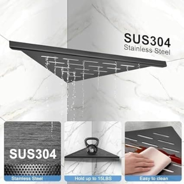 The corner shower caddy is made of SUS304 stainless steel, rust-proof and durable, easy to clean, hollowed out design, drains quickly and air dry, keep the items dry, suitable for damp bathroom. Brighten up your bathroom storage with our innovative shower corner shelf that serves as a versatile shampoo holder for your corner shower. Its sleek design fits perfectly into small spaces making it ideal for maximizing bathroom storage. Keep your bathroom essentials within reach and tidy on this functional and stylish shelf. Say goodbye to messy spaces and keep your bathroom organized effortlessly. Design in the bathroom corner caddy that combines functionality and aesthetics. The shower corner shelf is your first solution to efficiently organize your shower space, providing a durable and reliable storage solution that complements any bathroom decor. Easy to Install You just need to use a cutting machine to cut a groove about 0.2 inch deep and 10 inch long on a 90 degree wall corner or the gap between two ceramic tiles. Slowly press the corner shower shelf into position, and finally apply glue for better fixation. › See more product details; Product description Special features: Type: Shower Corner Shelf Material: SUS304 stainless steel. Size: 254mm x 254mm Shelf Thickness: 1.5mm Max. Load capacity: 6.8 kg. Installation method: wall mounted Colour: Black / Natural Package Includes:1 x Shower Corner Shelf Notes: 1. Design for 90° tile wall corners. 2. The load on the corner shelf depends on the thickness of your tile. 3. Groove depth 1/4 inch, but do not exceed the thickness of the tile to avoid damage to the waterproof layer.; Product description Special features: Type: Shower Corner Shelf Material: SUS304 stainless steel. Size: 254mm x 254mm Shelf Thickness: 1.5mm Max. Load capacity: 6.8 kg. Installation method: wall mounted Colour: Black / Natural Package Includes:1 x Shower Corner Shelf Notes: 1. Design for 90° tile wall corners. 2. The load on the corner shelf depends on the thickness of your tile. 3. Groove depth 1/4 inch, but do not exceed the thickness of the tile to avoid damage to the waterproof layer.; Special features: Type: Shower Corner Shelf Material: SUS304 stainless steel. Size: 254mm x 254mm Shelf Thickness: 1.5mm Max. Load capacity: 6.8 kg. Installation method: wall mounted Colour: Black / Natural Package Includes:1 x Shower Corner Shelf Notes: 1. Design for 90° tile wall corners. 2. The load on the corner shelf depends on the thickness of your tile. 3. Groove depth 1/4 inch, but do not exceed the thickness of the tile to avoid damage to the waterproof layer.