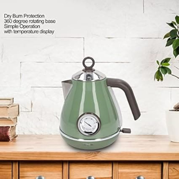 Dry fire protection: As soon as the water has reached the boiling temperature or there is no water in it, the dry boil protection system automatically switches off the power. Quick boil: the powerful kettle quickly boils up to 1.7 litres of water in just a few minutes, making it the perfect household appliance. 360 degree rotating base: The kettle is equipped with a 360 degree rotating base and easy to use. Temperature display: The exterior has an easy-to-read illuminated on/off switch, a thermometer and a water level window with volume markings. Retro painting process: With fine workmanship and retro painting technology, the appearance is exquisite and beautiful. › See more product details