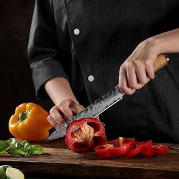Knife features: the professional meat knife and carving knife with olive wood handle has a knife length of 31.50 cm and a pure blade length of 20.00 cm. Razor sharp – thanks to the VG10 cutting core of this damascus knife, a blade hardness of 60±2 HRC is achieved. Thanks to the special heat treatment of the blades at over 800 °C and the cold treatment with nitrogen at -150 °C, the optimum is obtained from the high-quality blade steel. The blades of these knives are hand sanded and polished to achieve optimal cutting performance. This ensures that your professional kitchen knife is sharp and stays for a long time. Ergonomic design – perfectly balanced meat knife for meat and all fine cuts. The ergonomically shaped handle made of olive wood and the balance ensure fatigue-free work in the kitchen. The attractive design of the knives makes them not only functional, but also an eye-catcher in the kitchen. The meticulous workmanship and attention to details help ensure that the knives are precise and functional. Perfect as a gift – the professional Damascus meat knife is the perfect gift idea. Thanks to the beautiful gift box, the damascus knife can be given as a gift and is a great joy for any ambitious cook. The Damask chef's knife is a special gift for men, women and knife lovers Experience and expertise: At Wakoli we have experience in the production of knives and have a team of experts who are familiar with the production of high-quality damask blades. Through our experience, we have developed the knowledge and skills to make kitchen knives that meet the requirements of professional chefs and home chefs. We take our customers' feedback seriously and use it to constantly improve our range. › See more product details