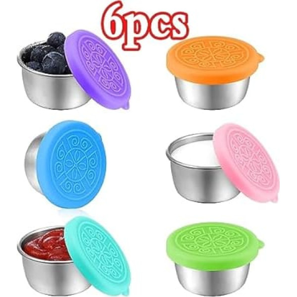 Safe material: salad dressing box spice containers are made of high quality stainless steel and high quality silicone, sturdy and durable, BPA free, safe and non-toxic, reusable, reduce the use of disposable seasoning containers, reduce waste and protect the environment. Easy to carry: compact size and good sealing. Perfect for portable dip containers that won't spill or leak! The completely leak-proof design keeps your lunch bag clean and can be placed in a bento box for lunch, easy to store and carry. EASY TO CLEAN: Easy to clean and sterilize, dishwasher and freezer safe. You can also use it to reheat food in the microwave and just put it in the dishwasher to clean it quickly and easily, cleaner and safer. HEALTHY FOOD Using our custom dipping cups reduces the use of disposable seasoning cups. Save money and the environment. Small food storage containers have a limited capacity, they can help you control the amount of dipping sauces and maintain a reasonable and healthy eating habit. VERSATILE APPLICABLE Suitable for salad dressings, hummus, sauces, spices, dips, peanut butter, nuts, dried fruits, mayonnaise, mustard, syrup, jam and other mini snacks, etc., and the perfect companion for bento boxes and packed lunches. › See more product details; Product description Product description: ▶ Silicone lid fits tightly on the salad dressing box, it will not leak even if you shake it, so you don't have to worry about the mess of the lunch box. Small and portable, perfect for school or work lunches, picnics, barbecues, parties, travel and more. ▶ The mini spice containers are versatile and perfect for dips and other small things. For example, salad dressings, sauces, jams, peanut butter, spices, sunflower seeds, dried cranberries, nuts and much more. Durable and easy to clean. Dishwasher and freezer safe. Leak-proof, airtight silicone lid, metal dip containers can be taken anywhere. Snack box cooler is available in 6 different colours, each colour looks beautiful and can be used to distinguish different sauces. ▶ Made of high quality stainless steel and food grade silicone for safe food contact; tested to be turned over without leaking. ▶ Stackable to save space. They are also dishwasher, microwave, refrigerator and freezer safe. Product specifications: Material: stainless steel + silicone. Colours: purple, pink, lake blue, orange, grass green, blue. Size: 5.8 x 3.3 cm/2.28 x 1.29 inches. Quantity: 6 pieces. Notes: 1. Due to the light and screen difference, the item's colour may be slightly different from the pictures. 2. Please allow 0.5-2 cm differences due to manual measurement. 3. If you have any questions or problems with the products you received, please contact us in time. Package includes: 6 x sauce bowls; Product description Product description: ▶ Silicone lid fits tightly on the salad dressing box, it will not leak even if you shake it, so you don't have to worry about the mess of the lunch box. Small and portable, perfect for school or work lunches, picnics, barbecues, parties, travel and more. ▶ The mini spice containers are versatile and perfect for dips and other small things. For example, salad dressings, sauces, jams, peanut butter, spices, sunflower seeds, dried cranberries, nuts and much more. Durable and easy to clean. Dishwasher and freezer safe. Leak-proof, airtight silicone lid, metal dip containers can be taken anywhere. Snack box cooler is available in 6 different colours, each colour looks beautiful and can be used to distinguish different sauces. ▶ Made of high quality stainless steel and food grade silicone for safe food contact; tested to be turned over without leaking. ▶ Stackable to save space. They are also dishwasher, microwave, refrigerator and freezer safe. Product specifications: Material: stainless steel + silicone. Colours: purple, pink, lake blue, orange, grass green, blue. Size: 5.8 x 3.3 cm/2.28 x 1.29 inches. Quantity: 6 pieces. Notes: 1. Due to the light and screen difference, the item's colour may be slightly different from the pictures. 2. Please allow 0.5-2 cm differences due to manual measurement. 3. If you have any questions or problems with the products you received, please contact us in time. Package includes: 6 x sauce bowls; Product description: ▶ Silicone lid fits tightly on the salad dressing box, it will not leak even if you shake it, so you don't have to worry about the mess of the lunch box. Small and portable, perfect for school or work lunches, picnics, barbecues, parties, travel and more. ▶ The mini spice containers are versatile and perfect for dips and other small things. For example, salad dressings, sauces, jams, peanut butter, spices, sunflower seeds, dried cranberries, nuts and much more. Durable and easy to clean. Dishwasher and freezer safe. Leak-proof, airtight silicone lid, metal dip containers can be taken anywhere. Snack box cooler is available in 6 different colours, each colour looks beautiful and can be used to distinguish different sauces. ▶ Made of high quality stainless steel and food grade silicone for safe food contact; tested to be turned over without leaking. ▶ Stackable to save space. They are also dishwasher, microwave, refrigerator and freezer safe. Product specifications: Material: stainless steel + silicone. Colours: purple, pink, lake blue, orange, grass green, blue. Size: 5.8 x 3.3 cm/2.28 x 1.29 inches. Quantity: 6 pieces. Notes: 1. Due to the light and screen difference, the item's colour may be slightly different from the pictures. 2. Please allow 0.5-2 cm differences due to manual measurement. 3. If you have any questions or problems with the products you received, please contact us in time. Package includes: 6 x sauce bowls