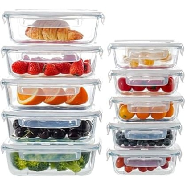 10-piece glass set with different sizes: the set contains 5 large (20 x 15 x 7 cm) and 5 small (15 x 10 x 6 cm) glass containers with lids. Perfect for meal prep glasses, food storage and keeping fruit, vegetables and leftovers fresh. Ideal for home, office or travel. Premium borosilicate glass: these food storage containers with lids are made of durable, heat-resistant borosilicate glass, which is non-toxic, BPA free and microwave, freezer and dishwasher safe. They are constructed to withstand extreme temperatures. INNOVATIVE VENT LID Each container features a vent lid with airtight seal that allows safe microwave use. Simply open the valve to release steam when heated and preserve freshness. Stackable & Space Saving Design: These glass containers with lids are stackable and maximize storage space in the fridge, freezer or pantry. The clear glass design allows for a quick overview of the contents and keeps your kitchen organized. Versatile and easy to clean: suitable for microwave (with open valve), freezer and dishwasher, these meal prep glasses are ideal for storage, heating and easy cleaning. A reliable choice for daily meal prep and storage needs. › See more product details