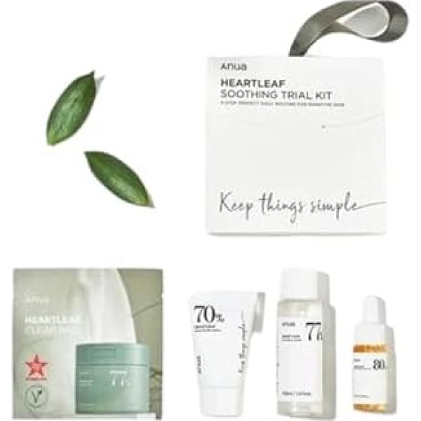 ANUA Heartleaf Smoothing Trial Kit Travel Size Gift Set with Heartleaf 77 Clear Pad, Toner & Lotion, Ampoule, Korean Skincare Skin Care Products ANUA › See more product details; Product description Product description This Heartleaf Soothing Test Kit contains: Heartleaf 77% Calming Toner, 40ml, Heartleaf 70 Daily Relief Lotion, 20ml, Heartleaf 80% Soothing Ampoule, 10ml Heartleaf 77 Clear Pad, 1 Pack x 2 Plasters, Heartleaf 77% Soothing Toner: a moisturizing toner formulated with 77% Houttuynia Cordata extract that soothes sensitive skin and protects the skin from external irritation. The sub acidic formula helps maintain the skin's oil moisture balance. Inirritative and contains 11 types of EWG Green Grade ingredients that are suitable for all skin types. Heartleaf 70 Daily Relief Lotion A moisturizing lotion formulated with 70% Heartleaf Extract that provides intensive hydration to the skin and helps soothe sensitive skin. Features 3 types of hyaluronic acids that keep the skin hydrated and protect the skin by forming a skin protection barrier. Contains EWG Green Level ingredients suitable for all skin types. Heartleaf 80% Soothing Ampoule - A nourishing ampoule formulated with 80% Houttuynia Cordata extract that helps soothe sensitive skin and protect skin from external irritation. Delivers intense moisture to the skin. The aqueous texture allows a thorough and quick absorption of moisture and nutrients without stickiness. Heartleaf 77 Clear Pad: a moisturising cleansing pad soaked with Heartleaf 77% soothing toner that helps remove blemishes and tighten pores. Formulated with Heartleaf Extract from Korea, which helps soothe sensitive and irritated skin. Contains Anti Sebum P (Pinus Palustris Leaf Extract, Evening Primrose Flower Extract, Ulmus Davidiana Root Extract, Pueraria Lobata Root Extract), which helps control sebum secretion and tighten pores. Directions Clean face, apply toner, use smoothing lotion, apply soothing ampoule; Product description Product description This Heartleaf Soothing Test Kit contains: Heartleaf 77% Calming Toner, 40ml, Heartleaf 70 Daily Relief Lotion, 20ml, Heartleaf 80% Soothing Ampoule, 10ml Heartleaf 77 Clear Pad, 1 Pack x 2 Plasters, Heartleaf 77% Soothing Toner: a moisturizing toner formulated with 77% Houttuynia Cordata extract that soothes sensitive skin and protects the skin from external irritation. The sub acidic formula helps maintain the skin's oil moisture balance. Inirritative and contains 11 types of EWG Green Grade ingredients that are suitable for all skin types. Heartleaf 70 Daily Relief Lotion A moisturizing lotion formulated with 70% Heartleaf Extract that provides intensive hydration to the skin and helps soothe sensitive skin. Features 3 types of hyaluronic acids that keep the skin hydrated and protect the skin by forming a skin protection barrier. Contains EWG Green Level ingredients suitable for all skin types. Heartleaf 80% Soothing Ampoule - A nourishing ampoule formulated with 80% Houttuynia Cordata extract that helps soothe sensitive skin and protect skin from external irritation. Delivers intense moisture to the skin. The aqueous texture allows a thorough and quick absorption of moisture and nutrients without stickiness. Heartleaf 77 Clear Pad: a moisturising cleansing pad soaked with Heartleaf 77% soothing toner that helps remove blemishes and tighten pores. Formulated with Heartleaf Extract from Korea, which helps soothe sensitive and irritated skin. Contains Anti Sebum P (Pinus Palustris Leaf Extract, Evening Primrose Flower Extract, Ulmus Davidiana Root Extract, Pueraria Lobata Root Extract), which helps control sebum secretion and tighten pores. Directions Clean face, apply toner, use smoothing lotion, apply soothing ampoule; Product description This Heartleaf Soothing Test Kit contains: Heartleaf 77% Calming Toner, 40ml, Heartleaf 70 Daily Relief Lotion, 20ml, Heartleaf 80% Soothing Ampoule, 10ml Heartleaf 77 Clear Pad, 1 Pack x 2 Plasters, Heartleaf 77% Soothing Toner: a moisturizing toner formulated with 77% Houttuynia Cordata extract that soothes sensitive skin and protects the skin from external irritation. The sub acidic formula helps maintain the skin's oil moisture balance. Inirritative and contains 11 types of EWG Green Grade ingredients that are suitable for all skin types. Heartleaf 70 Daily Relief Lotion A moisturizing lotion formulated with 70% Heartleaf Extract that provides intensive hydration to the skin and helps soothe sensitive skin. Features 3 types of hyaluronic acids that keep the skin hydrated and protect the skin by forming a skin protection barrier. Contains EWG Green Level ingredients suitable for all skin types. Heartleaf 80% Soothing Ampoule - A nourishing ampoule formulated with 80% Houttuynia Cordata extract that helps soothe sensitive skin and protect skin from external irritation. Delivers intense moisture to the skin. The aqueous texture allows a thorough and quick absorption of moisture and nutrients without stickiness. Heartleaf 77 Clear Pad: a moisturising cleansing pad soaked with Heartleaf 77% soothing toner that helps remove blemishes and tighten pores. Formulated with Heartleaf Extract from Korea, which helps soothe sensitive and irritated skin. Contains Anti Sebum P (Pinus Palustris Leaf Extract, Evening Primrose Flower Extract, Ulmus Davidiana Root Extract, Pueraria Lobata Root Extract), which helps control sebum secretion and tighten pores. Directions Clean face, apply toner, use smoothing lotion, apply soothing ampoule