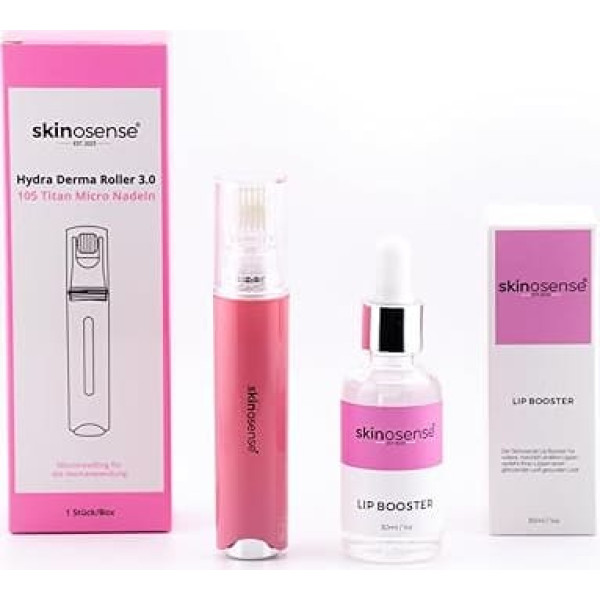 Plumper lips made visible: promotes volume and defines lip contours naturally. FINE NEEDLES - GREAT IMPACT: Microneedling optimizes serum intake for maximum effectiveness. Rich care: nutrient-rich serum with vitamin E and vegetable oils. Smooths lip wrinkles - Provides an even, nourished finish with silky shine. Easy and safe: quick application with visible results after just a few uses. › See more product details; Product description Product description The Skinosense Lip Booster Set combines the Hydra Derma Roller 3.0 with the specially developed lip booster serum for visibly fuller, smoother lips. The roller gently stimulates the lip area with 105 titanium micro-needles and improves the absorption of the nourishing serum, which is rich in natural oils and vitamin E. Fine lines are smoothed, the lips look plump, defined and intensively nourished. Ideal for anyone looking for a gentle but effective alternative to invasive treatments. Safety Warning For external use only, keep out of reach of children. Avoid contact with eyes. Discontinue use if signs of irritation or rash appear. Store in a cool and dry place.; Product description Product description The Skinosense Lip Booster Set combines the Hydra Derma Roller 3.0 with the specially developed lip booster serum for visibly fuller, smoother lips. The roller gently stimulates the lip area with 105 titanium micro-needles and improves the absorption of the nourishing serum, which is rich in natural oils and vitamin E. Fine lines are smoothed, the lips look plump, defined and intensively nourished. Ideal for anyone looking for a gentle but effective alternative to invasive treatments. Safety Warning For external use only, keep out of reach of children. Avoid contact with eyes. Discontinue use if signs of irritation or rash appear. Store in a cool and dry place.; Product description The Skinosense Lip Booster Set combines the Hydra Derma Roller 3.0 with the specially developed lip booster serum for visibly fuller, smoother lips. The roller gently stimulates the lip area with 105 titanium micro-needles and improves the absorption of the nourishing serum, which is rich in natural oils and vitamin E. Fine lines are smoothed, the lips look plump, defined and intensively nourished. Ideal for anyone looking for a gentle but effective alternative to invasive treatments. Safety Warning For external use only, keep out of reach of children. Avoid contact with eyes. Discontinue use if signs of irritation or rash appear. Store in a cool and dry place.