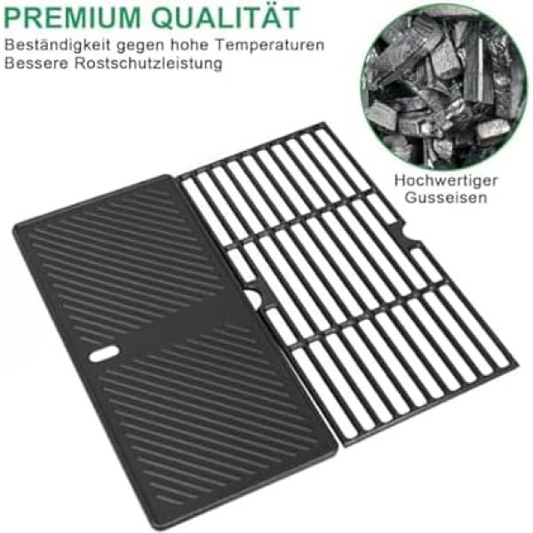 Pack of 2 cast iron grill grates and 1 grill plate; dimensions: 43 x 20.5 x 1.5 cm each, 43 x 61.5 x 1.5 cm in total; grill replacement parts for Enders gas grill, Enders Boston 3, Monroe Pro 3 SIK Turbo, Monroe Pro 3 SIK Turbo Shadow, Boston Black 3 K. , Colorado 3 I Turbo BBQ grill grate and grill pan accessories suitable for Charbroil Advantage series, Charbroil Gas2Coal 330, Barbecook Siesta 310, Landmann Triton 3 & 4, Broil King, Kenmore, Master Chef and other gas grill models. See description for other models Made of high-quality solid cast iron, non-stick coating, durable with strong oxidation, corrosion and heat resistance, good thermal conductivity, cooking food with better taste The cast grill replacement parts are perfect for grilling steaks, fish, chicken fillets and to give your grilled meat a perfect branding; which can distribute heat evenly over the entire surface Cast iron pans perfect for cooking burgers, pies, cheese, vegetables, bacon, frittatas and paninis, keeping food as they are. Easy to install and clean › See more product details; Product description 43 x 20.5 cm cast iron grill plate and cooking grate, cast iron grate and grill pan, gas grill replacement parts. Specifications: Dimensions: 43 x 20.5 x 1.5 cm. Material: solid cast iron. Package includes: Pack of 2 cooking grates Pack of 1 grill plate. Applicable models: Compatible with Enders gas grill: Enders Boston 3, Monroe Pro 3 SIK Turbo, Monroe Pro 3 SIK Turbo Shadow, Boston Black 3K Turbo, Colorado 3 I Turbo. Compatible with Charbroil Advantage: CHRG467-0002-W1, G4670002W1, G467-0002-W1, 63343015, 463344116, 415165379, 463370516, 4632408. 04, 463370516,463240904, 463343015, 463241704, 463241804, 463247004, 463250509, 463250510, 463250511, 46325050. 5512, 4563251505, 463251605, 463252005, 463252105, 463253905, 463254405, 463261306, 463261406, 463320109, 463320109. 0010, 463470109, 463631410, 463631411 Compatible with Kenmore:16113, 16115, 16117, 6400-122390-115, 415-16113, 415-16115, 415-16117, 415-16123, 415-16125, 415-1615. 16127 , 415.16113, 415.16115, 415.16117, 415.16123, 415.16125, 415.16127, 41516113, 415-16115, 41516117, 4151616. 123, 4, 415-6125, 41516127, 6400122390115 Compatible with Broil King: 987734, 987737, 987744, 987747, 987944, 987947, 9869-84, 9877-14, 9877-17, 9877-34, 9877-37, 9877-37. 44, 4, 9877-47, 9879-44, 9879-47, Sovereign 20, Sovereign 70, Sovereign 90, Sovereign 90S Compatible with Master Chef: T420LP. Compatible with Landmann Triton 3 & 4. Easy to install and clean, preheat on high for 15 minutes and clean with a grill brush Leave a layer of cooking oil on the cast iron cooking grate after each use Note: Please check the dimensions of your grill parts before placing the order; Product description 43 x 20.5 cm cast iron grill plate and cooking grate, cast iron grate and grill pan, gas grill replacement parts. Specifications: Dimensions: 43 x 20.5 x 1.5 cm. Material: solid cast iron. Package includes: Pack of 2 cooking grates Pack of 1 grill plate. Applicable models: Compatible with Enders gas grill: Enders Boston 3, Monroe Pro 3 SIK Turbo, Monroe Pro 3 SIK Turbo Shadow, Boston Black 3K Turbo, Colorado 3 I Turbo. Compatible with Charbroil Advantage: CHRG467-0002-W1, G4670002W1, G467-0002-W1, 63343015, 463344116, 415165379, 463370516, 4632408. 04, 463370516,463240904, 463343015, 463241704, 463241804, 463247004, 463250509, 463250510, 463250511, 46325050. 5512, 4563251505, 463251605, 463252005, 463252105, 463253905, 463254405, 463261306, 463261406, 463320109, 463320109. 0010, 463470109, 463631410, 463631411 Compatible with Kenmore:16113, 16115, 16117, 6400-122390-115, 415-16113, 415-16115, 415-16117, 415-16123, 415-16125, 415-1615. 16127 , 415.16113, 415.16115, 415.16117, 415.16123, 415.16125, 415.16127, 41516113, 415-16115, 41516117, 4151616. 123, 4, 415-6125, 41516127, 6400122390115 Compatible with Broil King: 987734, 987737, 987744, 987747, 987944, 987947, 9869-84, 9877-14, 9877-17, 9877-34, 9877-37, 9877-37. 44, 4, 9877-47, 9879-44, 9879-47, Sovereign 20, Sovereign 70, Sovereign 90, Sovereign 90S Compatible with Master Chef: T420LP. Compatible with Landmann Triton 3 & 4. Easy to install and clean, preheat on high for 15 minutes and clean with a grill brush Leave a layer of cooking oil on the cast iron cooking grate after each use Note: Please check the dimensions of your grill parts before placing the order; 43 x 20.5 cm cast iron grill plate and cooking grate, cast iron grate and grill pan, gas grill replacement parts. Specifications: Dimensions: 43 x 20.5 x 1.5 cm. Material: solid cast iron. Package includes: Pack of 2 cooking grates Pack of 1 grill plate. Applicable models: Compatible with Enders gas grill: Enders Boston 3, Monroe Pro 3 SIK Turbo, Monroe Pro 3 SIK Turbo Shadow, Boston Black 3K Turbo, Colorado 3 I Turbo. Compatible with Charbroil Advantage: CHRG467-0002-W1, G4670002W1, G467-0002-W1, 63343015, 463344116, 415165379, 463370516, 4632408. 04, 463370516,463240904, 463343015, 463241704, 463241804, 463247004, 463250509, 463250510, 463250511, 46325050. 5512, 4563251505, 463251605, 463252005, 463252105, 463253905, 463254405, 463261306, 463261406, 463320109, 463320109. 0010, 463470109, 463631410, 463631411 Compatible with Kenmore:16113, 16115, 16117, 6400-122390-115, 415-16113, 415-16115, 415-16117, 415-16123, 415-16125, 415-1615. 16127 , 415.16113, 415.16115, 415.16117, 415.16123, 415.16125, 415.16127, 41516113, 415-16115, 41516117, 4151616. 123, 4, 415-6125, 41516127, 6400122390115 Compatible with Broil King: 987734, 987737, 987744, 987747, 987944, 987947, 9869-84, 9877-14, 9877-17, 9877-34, 9877-37, 9877-37. 44, 4, 9877-47, 9879-44, 9879-47, Sovereign 20, Sovereign 70, Sovereign 90, Sovereign 90S Compatible with Master Chef: T420LP. Compatible with Landmann Triton 3 & 4. Easy to install and clean, preheat on high for 15 minutes and clean with a grill brush Leave a layer of cooking oil on the cast iron cooking grate after each use Note: Please check the dimensions of