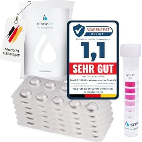 Compact home laboratory: 80 Rapid test tablets \; Product description Smardy 80 test tablets - 40 x pH value phenol red and 40 x DPD1 chlorine with 1 x test tube. Water analysis The first and most important step of pool/aquarium/swimming pool water/maintenance is to regularly check water values. This exam should be done at least once a week. We recommend 2-3 measurements per week. Application: 1. Chlorine content measurement: rinse the tester carefully (do not use detergent for cleaning) and then fill up to the 10 ml mark with swimming pool/pool/aquarium water. To measure free chlorine, add a DPD 1 tablet into the measuring chamber (note: do not touch tablet with your fingers) and close with the lid. Then shake the tester vigorously until the tablet is completely dissolved. Now compare with the colour scale on the tester and read the chlorine value. 2. pH value measurement: To measure the pH of the water, repeat the process with a Phenol Red tablet in the measuring chamber of the tester. Control / measurement regularly (1 - 2 x weekly) test pH value regularly (1 - 2 x weekly) test chlorine value. Recommended water values. Ideal pH value: 7.0 to 7.6. Ideal chlorine value: 1.0 to 3.0 mg/l. Package includes: - Reagent container made of plastic with screw cap. - 40 x phenol red tablets for pH value measurement. - 40 x DPD1 tablets for chlorine measurement; Product description Smardy 80 test tablets - 40 x pH value phenol red and 40 x DPD1 chlorine with 1 x test tube. Water analysis The first and most important step of pool/aquarium/swimming pool water/maintenance is to regularly check water values. This exam should be done at least once a week. We recommend 2-3 measurements per week. Application: 1. Chlorine content measurement: rinse the tester carefully (do not use detergent for cleaning) and then fill up to the 10 ml mark with swimming pool/pool/aquarium water. To measure free chlorine, add a DPD 1 tablet into the measuring chamber (note: do not touch tablet with your fingers) and close with the lid. Then shake the tester vigorously until the tablet is completely dissolved. Now compare with the colour scale on the tester and read the chlorine value. 2. pH value measurement: To measure the pH of the water, repeat the process with a Phenol Red tablet in the measuring chamber of the tester. Control / measurement regularly (1 - 2 x weekly) test pH value regularly (1 - 2 x weekly) test chlorine value. Recommended water values. Ideal pH value: 7.0 to 7.6. Ideal chlorine value: 1.0 to 3.0 mg/l. Package includes: - Reagent container made of plastic with screw cap. - 40 x phenol red tablets for pH value measurement. - 40 x DPD1 tablets for chlorine measurement; Smardy 80 test tablets - 40 x pH value phenol red and 40 x DPD1 chlorine with 1 x test tube. Water analysis The first and most important step of pool/aquarium/swimming pool water/maintenance is to regularly check water values. This exam should be done at least once a week. We recommend 2-3 measurements per week. Application: 1. Chlorine content measurement: rinse the tester carefully (do not use detergent for cleaning) and then fill up to the 10 ml mark with swimming pool/pool/aquarium water. To measure free chlorine, add a DPD 1 tablet into the measuring chamber (note: do not touch tablet with your fingers) and close with the lid. Then shake the tester vigorously until the tablet is completely dissolved. Now compare with the colour scale on the tester and read the chlorine value. 2. pH value measurement: To measure the pH of the water, repeat the process with a Phenol Red tablet in the measuring chamber of the tester. Control / measurement regularly (1 - 2 x weekly) test pH value regularly (1 - 2 x weekly) test chlorine value. Recommended water values. Ideal pH value: 7.0 to 7.6. Ideal chlorine value: 1.0 to 3.0 mg/l. Package includes: - Reagent container made of plastic with screw cap. - 40 x phenol red tablets for pH value measurement. - 40 x DPD1 tablets for chlorine measurement