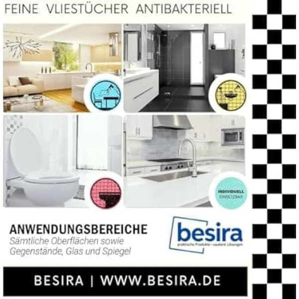 Long-lasting antibacterial – the antibacterial activity only develops in a damp cloth. Firmly embedded silver particles counteract microbial settlement and avoid germ growth in the cloth. Tested and certified by the Hohenstein Institute Use: especially for cleaning sensitive surfaces, high-gloss kitchens, displays, streak-free shine without re-polishing, simply allow used cloths to air dry, free from odour emissions. Can also be used only with water (suitable for detergents allergy sufferers) Excellent quality – hygiene safety thanks to colour coding with 3 pictograms (red, blue, yellow) | as often as desired at 60°C without fabric softener. Washable, towels remain soft, colour and dimensionally stable. Made in Germany Cleaning: high water absorption and surface performance for daily surface cleaning. Environmentally friendly – the towels are reusable and last several years, simply wash at up to 60°C if necessary without fabric softener and without tumble dryer Our special kitchen cleaning cloths / dish cloths and sponge cloth can be found on Amazon at https://www.amazon.de/dp/B08BVS92YF – of course also permanently antibacterial. and durable › See more product details; Product description Besira Microfibre fleece cloths are permanently antibacterial, stop unpleasant odours, clean perfectly and hygienically even without chemicals, just with water. Firmly bound active silver kills up to 99.99% of bacteria on the cloths. Ideal for daily surface cleaning, for mist moist wiping without streaks, without re-polishing. Also suitable for delicate painted surfaces and high-gloss kitchens. Lifetime active. Even at 60 °C, the active silver is not rinsed out.; Product description Besira Microfibre fleece cloths are permanently antibacterial, stop unpleasant odours, clean perfectly and hygienically even without chemicals, just with water. Firmly bound active silver kills up to 99.99% of bacteria on the cloths. Ideal for daily surface cleaning, for mist moist wiping without streaks, without re-polishing. Also suitable for delicate painted surfaces and high-gloss kitchens. Lifetime active. Even at 60 °C, the active silver is not rinsed out.; Besira Microfibre fleece cloths are permanently antibacterial, stop unpleasant odours, clean perfectly and hygienically even without chemicals, just with water. Firmly bound active silver kills up to 99.99% of bacteria on the cloths. Ideal for daily surface cleaning, for mist moist wiping without streaks, without re-polishing. Also suitable for delicate painted surfaces and high-gloss kitchens. Lifetime active. Even at 60 °C, the active silver is not rinsed out.