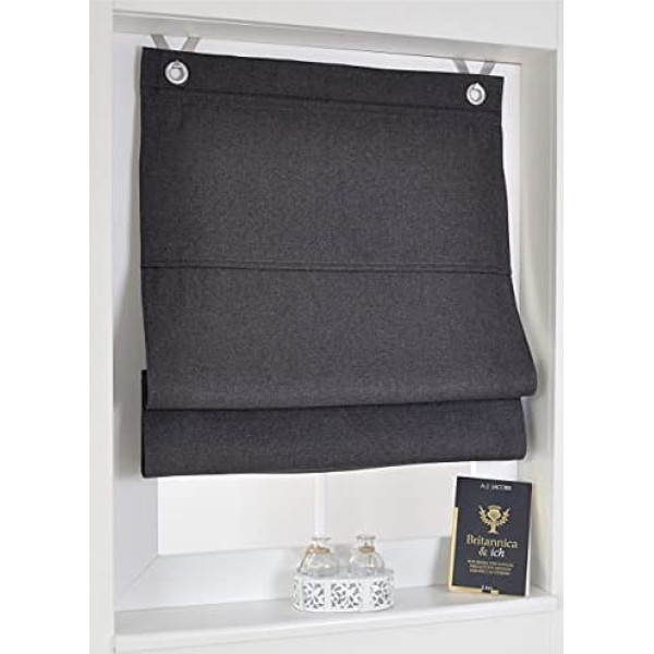 Includes decorative window hooks and mounting material Opaque, darkening, dims light incidence by 95% Provides a pleasant twilight light, gives a cosy atmosphere in the bedroom and children's room Easy installation without screws or drilling: Just hang it up and you’re ready. Soft, heavy quality made from 100% polyester, easy-care, washable at 30°C › See more product details; Product description Assembly without screws or drilling.With this decorative Roman blind, we offer you a refined product that will delight you with its ingeniously simple fastening technology. All you have to do is attach the included hooks to the window frame and then hang the roller blind on the eyelets – that's it! The drill can stay in the cupboard.This practical and smart Roman blind saves you not only a lot of work with the installation, but your landlord also won't get angry because of holes in the window frame. Suitable for frame thickness of approx. 13-24 mm. You can individually decide on the gathering with a pull cord by using a cord stopper.Contents: 1 roller blind including hooks and adhesive knobs for suspension and stabilisation for widths 45, 60 and 80 cm, each with 2 eyelets and hooks; for the 100 cm width there is a third eyelet / hook in the middle of the blind.; Product description Assembly without screws or drilling.With this decorative Roman blind, we offer you a refined product that will delight you with its ingeniously simple fastening technology. All you have to do is attach the included hooks to the window frame and then hang the roller blind on the eyelets – that's it! The drill can stay in the cupboard.This practical and smart Roman blind saves you not only a lot of work with the installation, but your landlord also won't get angry because of holes in the window frame. Suitable for frame thickness of approx. 13-24 mm. You can individually decide on the gathering with a pull cord by using a cord stopper.Contents: 1 roller blind including hooks and adhesive knobs for suspension and stabilisation for widths 45, 60 and 80 cm, each with 2 eyelets and hooks; for the 100 cm width there is a third eyelet / hook in the middle of the blind.; Assembly without screws or drilling.With this decorative Roman blind, we offer you a refined product that will delight you with its ingeniously simple fastening technology. All you have to do is attach the included hooks to the window frame and then hang the roller blind on the eyelets – that's it! The drill can stay in the cupboard.This practical and smart Roman blind saves you not only a lot of work with the installation, but your landlord also won't get angry because of holes in the window frame. Suitable for frame thickness of approx. 13-24 mm. You can individually decide on the gathering with a pull cord by using a cord stopper.Contents: 1 roller blind including hooks and adhesive knobs for suspension and stabilisation for widths 45, 60 and 80 cm, each with 2 eyelets and hooks; for the 100 cm width there is a third eyelet / hook in the middle of the blind.