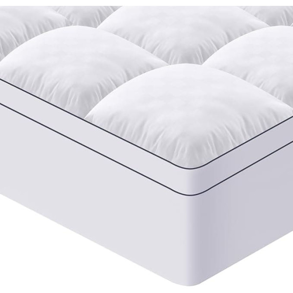 Comfortable sleep: with 1200 g/m² polyester, this is the thickest mattress protector on the market. The sumptuous 1200gsm filling provides soft padding to your hard mattress, giving you a bouncy feel and cloud-like sleeping comfort. High quality: this breathable premium mattress protector is made of a high-quality 3D filling that always stays in place thanks to the special square quilting. The breathable fabric promotes air circulation and prevents overheating, so you can enjoy a refreshing and restful relaxation experience. All-round deep design: the highly elastic knitted hem and 360° all-round design ensure that the mattress protector fits perfectly to the mattress, making it ideal for mattresses under 35 cm high. The mattress protector stays in place even when you turn over while sleeping. Healthy and machine washable: our mattress toppers are machine washable and are made of anti-allergenic materials that are not only comfortable on the skin, but also ensure a fresh and dry sleeping environment, ideal for a healthy sleep all year round. As the mattress topper is vacuum packed, it takes a certain time to return to its original shape. It is recommended to leave the mattress topper for at least 3 hours before use, preferably in the sunlight so that it quickly becomes fluffy again. › See more product details