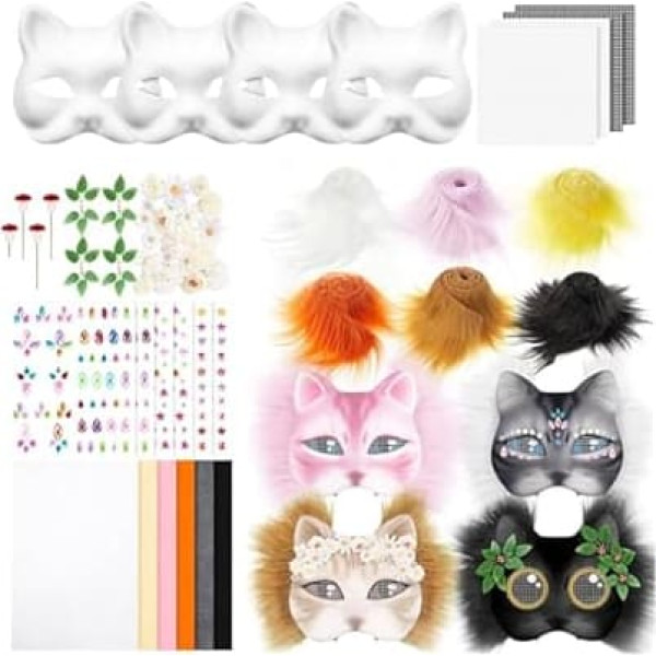 YUGSHNKFC 4pcs Katzen Gesichtsmaske Weiße Papiermaske Unbemalte Maskeradenmaske Mit Pelziger Stoff Trim Eye Mesh Felted Stoffaufkleber
