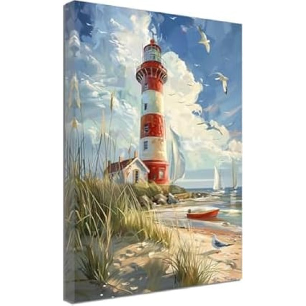 ZQQART Canvas Picture with Lighthouse and Ocean Red Stripes Lighthouse Coastal Picture Painting Beach Ocean Boat Seagulls Picture Rustic Artwork for Living Room Bedroom Home Wall Decoration (40 x 60
