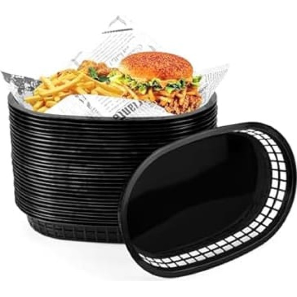 JJWNMLL Pack of 16 Serving Baskets, Chips Baskets, Reusable Oval Plastic Fruit Baskets, Food Baskets for Burgers, Sandwiches, Chips, Barbecues, Parties (Black, 30 Pieces (27 x 17 cm))
