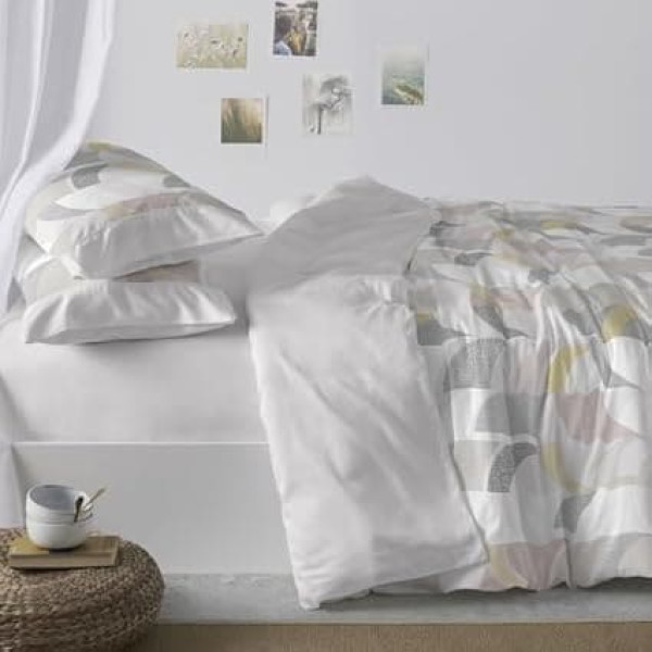 Product: Vintage geometric print bedding set consisting of stripes and uneven dots, light grey background, with white motifs, different shades of grey, sand and mustard. Back light grey. Cushion in the same design with light grey appliqué fitted sheet, light grey Set size: 1 x duvet cover 220 x 260 cm. One pillowcase 45 x 155 cm. One fitted sheet 135 x 190/200 cm. Available in multiple sizes. Features: Soft Feel. Quick and easy ironing. Long service life. Wash and dry inside out. It is recommended to wash before first use. Available as bedding set Material: High quality fabric, 50% cotton - 50% polyester, for a duvet cover that is primarily soft, but also very durable and easy to iron. 144 threads per square centimetre and the guarantee that no pilling will complete the features of this duvet cover set. It is advisable to wash gently before first use so that the product gets its best feel. Care: Machine wash on a gentle cycle and a maximum temperature of 40°C. Tumble dry, normal cycle. Do not bleach. Iron at medium temperature. Do not dry clean › See more product details