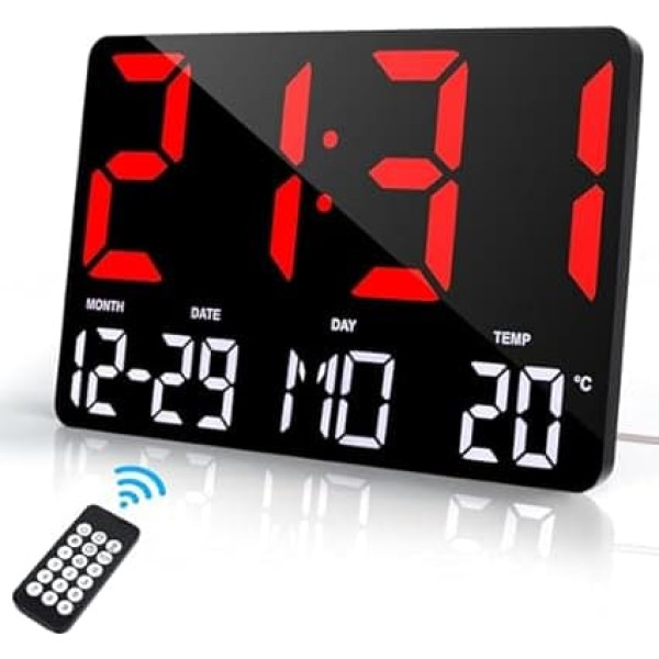12 inch large LED display: This digital wall clock has a 12 inch screen and a large number display, which makes it easy to see the time, date, day and temperature even from a distance or from different angles, and offers you a clearer time display than an ordinary quartz wall clock. Power cable and memory function: this digital watch requires connecting a power cord to work. Note: The adapter is not included. It comes with a button battery that supports the memory function that stores the time and alarm settings in the event of an unexpected power failure. When the power supply is restored, the watch does not need to be reset. Table clock and wall clock: Equipped with 3 robust hooks and a sturdy stand, you can hang this digital clock with large display on the wall or place it on your desk, which offers you a lot of comfort in daily life. Comfortable remote control: apart from the buttons on the back, the LED watch is equipped with a remote control that allows you to easily set the time or stop the alarm. When the alarm goes off, simply press any button on the remote control to turn off the alarm. Adjustable brightness: there are 4 brightness levels and a switch-off function for the digital wall clock. You can manually adjust the brightness or activate the light-sensitive function to automatically adjust the brightness, so that the light of the watch does not disturb you during bedtime. Snooze function: when the alarm clock rings, you can press the \
