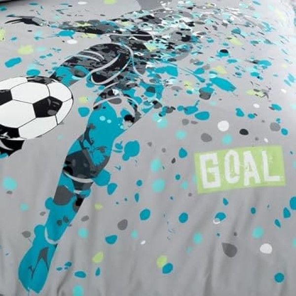 Start the perfect nights sleep with Bedlam's Football Comforter Set in stylish grey with a vibrant teal reverse. With its playful, football-inspired design, this bedding set brings the excitement of the field right into the nursery. Made from cozy, breathable fabric for dream-worthy comfort. This duvet cover set is the perfect bedding for a young football fan. With Bedlam every bedtime is an adventure waiting to happen! Bedlam is a fun bedding range for free-range children, where bedrooms are places where imagination stirs up turmoil. Bold colors and bright, appealing designs make any bedroom a place where the adventures of childhood begin To fit a standard UK single duvet - 140cm width x 200cm length - pillow sham 76cm x 48cm Includes 1 x single duvet cover and 1 x pillowcase › See more product details; Product description Start the perfect nights sleep with Bedlam's Football Comforter Set in stylish grey with a vibrant teal reverse. With its playful, football-inspired design, this bedding set brings the excitement of the field right into the nursery. Made from cozy, breathable fabric for dream-worthy comfort. This duvet cover set is the perfect bedding for a young football fan. With Bedlam every bedtime is an adventure waiting to happen!; Product description Start the perfect nights sleep with Bedlam's Football Comforter Set in stylish grey with a vibrant teal reverse. With its playful, football-inspired design, this bedding set brings the excitement of the field right into the nursery. Made from cozy, breathable fabric for dream-worthy comfort. This duvet cover set is the perfect bedding for a young football fan. With Bedlam every bedtime is an adventure waiting to happen!; Start the perfect nights sleep with Bedlam's Football Comforter Set in stylish grey with a vibrant teal reverse. With its playful, football-inspired design, this bedding set brings the excitement of the field right into the nursery. Made from cozy, breathable fabric for dream-worthy comfort. This duvet cover set is the perfect bedding for a young football fan. With Bedlam every bedtime is an adventure waiting to happen!