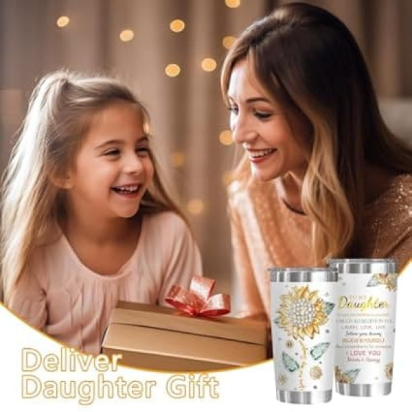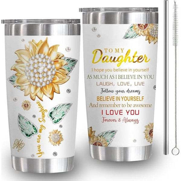 Daughter Gift Your daughter will be overjoyed to receive this thoughtful gift, and every sip from this beautiful tumbler will remind her of your love and appreciation. Gift for daughter adult birthday: choose a meaningful and practical gift to celebrate your daughter's youth dedication, she will certainly appreciate it. This coffee mug is an ideal birthday gift for daughter and adult. It is a wonderful choice for Christmas, birthdays and Easter. DELICATELY PACKAGED Our double wall insulated tumbler is designed to keep your drinks cold or hot for extended periods of time, making it perfect for coffee, soda, cola, juice and more. The package comes complete with 1 stainless steel straw (including a straight straw and a stainless steel straw brush), 1 sliding lid for the tumbler, 1 cleaning brush, all neatly packed in a unique box. POWERFUL With humanized design, the streamlined cup body design is both aesthetic and practical. The thickened non-slip base makes it easy to use and store. With its double layer airtight design, you can enjoy a cup of fragrant hot tea or refreshing ice cold water during a strenuous journey on a scorching summer day. (Retains heat for over 6 hours, keeps drinks cold for over 12 hours) DUST PROOF LID This tumbler features a BPA free sliding lid with a food grade silicone gasket that ensures a tight fit to keep the tumbler leak-proof. Comfortable to wear and easy to clean, it is recommended to hand wash for best results. MULTIPURPOSE FOR ANY OCCASION Our travel tumbler is suitable for both indoor and outdoor use. Perfect for enjoying drinks at home, beach, pool, office, parties, camping and hiking.