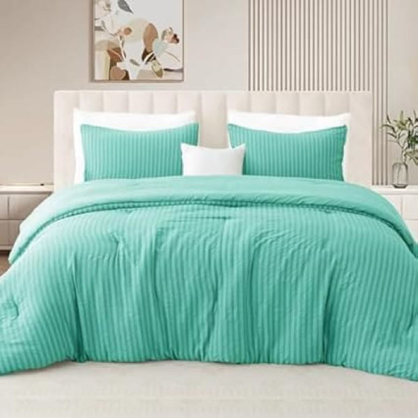 What you get: A cooling seersucker duvet (200 x 200 cm) and 2 matching pillowcases (50 x 75 cm). Note: the comforter set comes in a vacuum sealed package, please expose it to sunlight and tap it gently for a few hours or put it in the dryer for fifteen minutes after receiving it, then it will be nicely puffed up again Seersucker pattern: the lightweight comforter sets feature a slightly folded, textured seersucker design, combined with dark and bright, alternating vertical stripe patterns to create a vivid, three-dimensional visual experience, adding a unique sense of romance and elegance to your room Quality material: the duvet is made of cationic dyed seersucker fabric on the surface and brushed microfiber fabric in the same color on the back, which make the duvet ultra soft, breathable, skin-friendly and noiseless, easy to fall asleep YEAR ROUND USE The comforter sets are filled with down alternatives made of polyester, which makes them lightweight but warm enough for all seasons Easy care: machine washable in cold water and dry on low in a machine that can hold a load of at least seven kg or dry in the sun; please do not bleach or iron › See more product details
