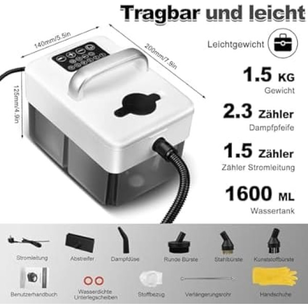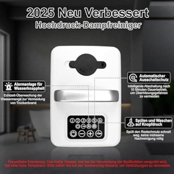 Steam cleaner: 2500 W powerful portable high pressure steam cleaner quickly releases 221℉/105°C high temperature and 3BAR pressure steam in 12 seconds, which can easily remove and clean stubborn grease, deep stains and dirt from all types of surfaces. No need for chemical detergents, natural cleaning can be done with just water, which is safe to use even in homes with children and pets. New Function This newly upgraded high pressure steam cleaner is equipped with an intelligent water shortage warning system that reminds you when the water is no longer enough, so you no longer have to worry about the amount of water remaining when cleaning. There is also a 10-minute automatic shut-off function, so you no longer have to worry about forgetting to turn off the device after switching on - safe and hassle-free! 6 SPEED ADJUSTMENT Our portable handheld steam cleaner has 6 adjustable speeds, according to the specific cleaning needs, just press the \; Product description steam cleaner; Product description steam cleaner; steam cleaner