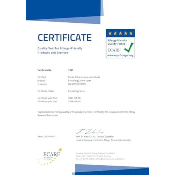 No coating and no \; Product description * Pack of 2 anti-mite covers, made from a tested fabric by several independent research institutes such as ECARF (European Centre for Allergy Research Foundation), the Institute for Hygiene of Ruhr Area in Gelsenkirchen (Germany), TÜV Rheinland and IBT Reference Laboratory in the USA. * Effective barrier against mites and other allergens without chemical treatment. * The covers are fully zipped No cover and no plastic effect, highly breathable and absorbent. * Soft, very comfortable, durable and allows water vapor and air to pass through. * Contains no dyes or other chemical treatments that would affect health and reduce effectiveness after a few washes. * The fabric and covers are made in Europe and comply with European quality standards. * It is recommended to wash the covers at 60º before first use: the first washes will make the fabric softer and more comfortable. * The dust mite protection cover should be placed directly on the cushion so that it is completely covered by the cover. For a reliable closure, the back of the inner material is placed between the zip and the cushion. Then the cover is closed with the rack. Over the mite-proof covers, it is necessary to put a normal sheet set. * Machine washable up to 90º is possible. * Material Composition: 70% Polyester and 30% Polyamide; Product description * Pack of 2 anti-mite covers, made from a tested fabric by several independent research institutes such as ECARF (European Centre for Allergy Research Foundation), the Institute for Hygiene of Ruhr Area in Gelsenkirchen (Germany), TÜV Rheinland and IBT Reference Laboratory in the USA. * Effective barrier against mites and other allergens without chemical treatment. * The covers are fully zipped No cover and no plastic effect, highly breathable and absorbent. * Soft, very comfortable, durable and allows water vapor and air to pass through. * Contains no dyes or other chemical treatments that would affect health and reduce effectiveness after a few washes. * The fabric and covers are made in Europe and comply with European quality standards. * It is recommended to wash the covers at 60º before first use: the first washes will make the fabric softer and more comfortable. * The dust mite protection cover should be placed directly on the cushion so that it is completely covered by the cover. For a reliable closure, the back of the inner material is placed between the zip and the cushion. Then the cover is closed with the rack. Over the mite-proof covers, it is necessary to put a normal sheet set. * Machine washable up to 90º is possible. * Material Composition: 70% Polyester and 30% Polyamide; * Pack of 2 anti-mite covers, made from a tested fabric by several independent research institutes such as ECARF (European Centre for Allergy Research Foundation), the Institute for Hygiene of Ruhr Area in Gelsenkirchen (Germany), TÜV Rheinland and IBT Reference Laboratory in the USA. * Effective barrier against mites and other allergens without chemical treatment. * The covers are fully zipped No cover and no plastic effect, highly breathable and absorbent. * Soft, very comfortable, durable and allows water vapor and air to pass through. * Contains no dyes or other chemical treatments that would affect health and reduce effectiveness after a few washes. * The fabric and covers are made in Europe and comply with European quality standards. * It is recommended to wash the covers at 60º before first use: the first washes will make the fabric softer and more comfortable. * The dust mite protection cover should be placed directly on the cushion so that it is completely covered by the cover. For a reliable closure, the back of the inner material is placed between the zip and the cushion. Then the cover is closed with the rack. Over the mite-proof covers, it is necessary to put a normal sheet set. * Machine washable up to 90º is possible. * Material Composition: 70% Polyester and 30% Polyamide
