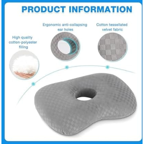 Side sleeper pillow: This ear piercing pillow adopts a cute donut shape, measures 12.6 x 17.3 inches, has a 3.5 inch round hole in the middle, compact and easy to carry. Larger size to give you a more comfortable sleep. The hole in the middle gives your ears that have pain or wearing headphones a place to rest without feeling pressure and friction, making your sleep more comfortable. Ear protection: The ear hole cushion has a / 3.5 inch ear hole in the middle, which can relieve ear pressure when lying on your side, help you relieve ear pain, ear inflammation and pressure points and provide a comfortable sleeping environment for your ears. Especially suitable for CNH, piercing aftercare and relief of ear pain SOFT & COMFORTABLE This 17 inch ear piercing pillow cover is made of skin-friendly polyester fiber and filled with soft and breathable cotton, which can be machine washed and dried. Our ear pain pillow is an ideal choice if you find that it is difficult to sleep due to an ear disease or injury, which keeps you cool and comfortable. Ergonomic design: our ear hole cushion with armhole is thoughtfully designed to optimally support side sleepers, cushion with hole for ear ensures comfort during the recovery of ear piercings or just enjoy a restful sleep. Applicable to situations: our ear hole pillow is perfect for people with multiple or new ear piercings, supportive pillow with ear hole is also an ideal gift for ear surgery, side sleepers and people who are used to wearing headphones or earplugs to sleep › See more product details; Product description Feature: 1. Suitable for people who suffer from ear pain, relief from ear pain, ear infections, neilmed piercing aftercare, need CNH symptoms or have had ear surgery. Functionality – Whether you wear earrings, hearing aids or headphones, the ear piercing cushion effectively protects your ears from friction and compression and relieves pain and inflammation caused by ear infections. 3. Material: made of high-quality materials to provide comfortable support, the doughnut-shaped ear piercing design ensures ear comfort and protection. Product Features: Colour: grey. Material: Cotton Size:12.6 x 17.3 inch Weight: 470g Cushion shape: rectangular. Package includes: 1 x Ear Piercing Pillow Notes: The size and weight of the product are measured manually, and it is normal to have errors. Please refer to the actual product.; Product description Feature: 1. Suitable for people who suffer from ear pain, relief from ear pain, ear infections, neilmed piercing aftercare, need CNH symptoms or have had ear surgery. Functionality – Whether you wear earrings, hearing aids or headphones, the ear piercing cushion effectively protects your ears from friction and compression and relieves pain and inflammation caused by ear infections. 3. Material: made of high-quality materials to provide comfortable support, the doughnut-shaped ear piercing design ensures ear comfort and protection. Product Features: Colour: grey. Material: Cotton Size:12.6 x 17.3 inch Weight: 470g Cushion shape: rectangular. Package includes: 1 x Ear Piercing Pillow Notes: The size and weight of the product are measured manually, and it is normal to have errors. Please refer to the actual product.; Feature: 1. Suitable for people who suffer from ear pain, relief from ear pain, ear infections, neilmed piercing aftercare, need CNH symptoms or have had ear surgery. Functionality – Whether you wear earrings, hearing aids or headphones, the ear piercing cushion effectively protects your ears from friction and compression and relieves pain and inflammation caused by ear infections. 3. Material: made of high-quality materials to provide comfortable support, the doughnut-shaped ear piercing design ensures ear comfort and protection. Product Features: Colour: grey. Material: Cotton Size:12.6 x 17.3 inch Weight: 470g Cushion shape: rectangular. Package includes: 1 x Ear Piercing Pillow Notes: The size and weight of the product are measured manually, and it is normal to have errors. Please refer to the actual product.