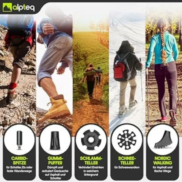 Ultra light and robust – 7075 aluminium from aviation or carbon 3K – the Alpteq these materials provide maximum stability with minimal weight and are perfect for long hikes and challenging trails. Compact and adjustable - also suitable for children – with an adjustable length of 100-120 cm, the pink poles can be easily adjusted and stored compactly. The pack size is 35 cm. Thanks to their flexible size, they are ideal for adults and children who want to experience their first hiking adventures. For adults, the green hiking poles are the perfect choice. Ergonomic and non-slip – the natural cork handle adapts to your hand, absorbs moisture and ensures maximum comfort. The non-slip EVA extension provides extra grip on steep climbs. Quality tested in the Austrian Alps and sustainably produced – the Alpteq hiking poles have been intensively tested in the Austrian Alps to ensure the highest quality and durability. In addition, we pay attention to sustainable production for environmentally conscious outdoor enthusiasts. Exclusive transport case and free emergency poncho – the Alpteq hiking poles come in an elegant, high-quality transport case, which not only ensures safe storage, but is also ideal as a gift. In addition, a handy emergency poncho is included in the set - perfect for unpredictable weather conditions. › See more product details; Product description These high-quality hiking poles made of sturdy aluminium or high-quality carbon are the perfect companion for any outdoor adventure. With an optimal ratio of stability and lightness. The ergonomic cork handle ensures comfortable grip and comfort on long tours. Thanks to the clever folding technology, the poles can be transported in the included hard case to save space. The set includes practical accessories such as snow plates, mud plates, Nordic walking attachments, rubber buffers and an emergency poncho. The poles are height adjustable and are ideal for hiking, trekking and Nordic walking in any terrain. Thanks to the flexible length adjustment, they are also suitable for children who want to gain their first experience when hiking or trekking. The robust construction and high-quality materials ensure long-lasting reliability during all outdoor activities. The elegant transport case makes these hiking poles not only particularly practical for transport, but also an ideal gift idea for outdoor enthusiasts - whether for birthdays, Christmas or special occasions.; Product description These high-quality hiking poles made of sturdy aluminium or high-quality carbon are the perfect companion for any outdoor adventure. With an optimal ratio of stability and lightness. The ergonomic cork handle ensures comfortable grip and comfort on long tours. Thanks to the clever folding technology, the poles can be transported in the included hard case to save space. The set includes practical accessories such as snow plates, mud plates, Nordic walking attachments, rubber buffers and an emergency poncho. The poles are height adjustable and are ideal for hiking, trekking and Nordic walking in any terrain. Thanks to the flexible length adjustment, they are also suitable for children who want to gain their first experience when hiking or trekking. The robust construction and high-quality materials ensure long-lasting reliability during all outdoor activities. The elegant transport case makes these hiking poles not only particularly practical for transport, but also an ideal gift idea for outdoor enthusiasts - whether for birthdays, Christmas or special occasions.; These high-quality hiking poles made of sturdy aluminium or high-quality carbon are the perfect companion for any outdoor adventure. With an optimal ratio of stability and lightness. The ergonomic cork handle ensures comfortable grip and comfort on long tours. Thanks to the clever folding technology, the poles can be transported in the included hard case to save space. The set includes practical accessories such as snow plates, mud plates, Nordic walking attachments, rubber buffers and an emergency poncho. The poles are height adjustable and are ideal for hiking, trekking and Nordic walking in any terrain. Thanks to the flexible length adjustment, they are also suitable for children who want to gain their first experience when hiking or trekking. The robust construction and high-quality materials ensure long-lasting reliability during all outdoor activities. The elegant transport case makes these hiking poles not only particularly practical for transport, but also an ideal gift idea for outdoor enthusiasts - whether for birthdays, Christmas or special occasions.