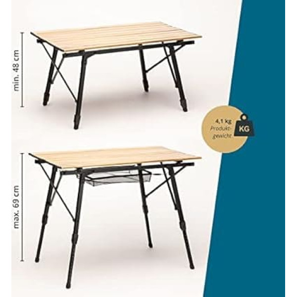 ✔ Height adjustable: The Skandika Jamsa camping table with a surface of 90 x 51.5 cm has finely adjustable feet with 10 markings for easy height adjustment of the table between 48 and 69 cm. ✔ Light as a feather: the folding camping table made of aluminium can be easily transported and stowed away with a weight of only 4.1 kg and the included carry bag. ✔ Weatherproof and stable: the high-quality frame supports a load of up to 50 kg. The easy-care and weatherproof aluminium makes Jamsa a durable outdoor table. ✔ Includes mesh shelf: the mesh shelf can be easily hooked under the table top and serves as an extra storage compartment for newspapers, games and similar. ✔ Easy to assemble: The assembly takes place in just a few simple steps without tools. The table top is simply hooked and then rolled out over the table. › See more product details
