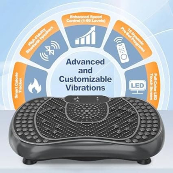 Versatile fitness device: the vibration plate promotes muscle building, weight loss and the breakdown of cellulite. Also includes a skipping rope and an elastic pull rope. With the skipping rope, you can continue to improve your full body workout and train the upper body muscles with the elastic pull rope. So you can achieve a comprehensive training effect. Compact and portable design: the vibration device is compact and saves more space than most electronic fitness equipment, making it easy to store and carry. So you can enjoy efficient training anytime and anywhere. Clear and easy to read touch display: the vibration plate is equipped with a touch-sensitive display that is easy and intuitive to use, and the screen is clear and easy to read, making your training more convenient and efficient. Flexible intensity adjustment: the vibration plate has 99 intensity levels and 5 preset programs. If you want a fixed intensity, choose the manual mode to increase/decrease the intensity yourself. If you want an irregular vibration intensity, you can choose the automatic mode in which the pre-program runs for 15 minutes. So different training needs can be met. Music is the best training booster: The vibration plate has its own Bluetooth speaker that allows you to listen to your favourite music during training. The strong rhythmic music is the best workout booster and brings fun to your workout. › See more product details