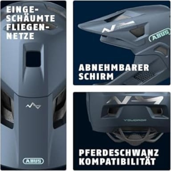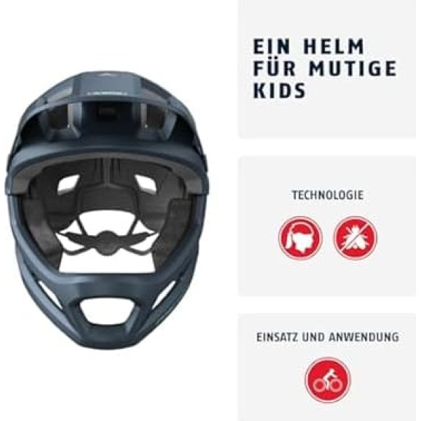 Areas of use: Modern and stably designed full face helmet for mountain biking trails, skate parks, downhill rides or everyday life, both for girls and boys Stable and safe: Shock-absorbing hard foam shaped into an impact-resistant outer shell, the in-mould process creates a durable connection for a robust helmet Flexibility: The removable chin bar allows use of the helmet as an open face variant Breakaway function: When children and teenagers get stuck or fall, the Velcro connection between helmet and visor breaks away. This prevents the head from hitting the neck. Individual fit: The Zoom Ace mountain biking adjustment system with a non-slip adjustment wheel at the back of the head allows individual adjustment to the wearer's head circumference. For braids: Height-adjustable adjustment system at the back of the head can create enough space for a braid, ideal for children and teenagers with long hair Visibility: High visibility thanks to large, bright reflectors with particularly high reflection effects Ventilation: 9 air inlets and 5 air outlets, which are connected by flow channels, support very good ventilation and counteract heat build-up. › See more product details