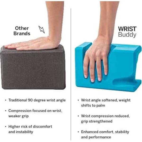 60% LESS WRIST PRESSURE | Doctor design repositions the wrist and shifts the weight to the palm. Best support for weight bearing poses, yoga accessories for women and men, gymnastics, workout, handstand 25% narrower ergonomic grip compared to standard blocks and wedges | Provides maximum grip strength and stability | Yoga Essentials | Meditation Accessories Pilates Peloton Push Up Crossfit TEXTURED HAND DESIGN FOR NON-SLIP GRIP | Best tools for comfort and stability to master all your poses, best yoga props, yoga starter kit, yoga accessories, closed cell foam with beveled edges TESTED & APPROVED | Hand and wrist friendly design, approved by yoga studios and teachers. No yoga strap, yoga bolster, yoga wedge, yoga blanket or towel, latex free, eco friendly Easy to Use | See video for hand placement. Marked for right and left. Center your hand on the wrist arch to find your sweet spot. Fingers do not need to fill in any Colours: blue, lavender, black, grey › See more product details; Product description Why choose Wrist Buddy Yoga Blocks over the other stuff? It's simple. Our advanced hand shaped block provides a better fit, more comfort and a stronger grip. Traditional rectangular blocks are flat, wide and bulky. Your hands are not flat, your blocks should not be either. Now everything is well with happy hands. Wrist Buddy is a sports doctor designed block based on ergonomic principles. These blocks correspond to the natural shape of your hands, which is crucial for better support and comfort. Also, flat blocks bend the wrist almost 90 degrees, a weak and vulnerable position. Wrist Buddy blocks reduce the wrist angle for stronger weight-bearing. In addition, our design shifts the weight from the wrist to the palm and strengthens the grip. These features give you improved comfort, support and stability...better than ever. Imagine how increased comfort on your blocks could greatly improve your practice. With Wrist Buddy blocks you'll gain the foundation for that extra comfort and stability, feeling safe, calm, and secure, as you grow your practice. Colours: teal, lavender, grey, black; Product description Why choose Wrist Buddy Yoga Blocks over the other stuff? It's simple. Our advanced hand shaped block provides a better fit, more comfort and a stronger grip. Traditional rectangular blocks are flat, wide and bulky. Your hands are not flat, your blocks should not be either. Now everything is well with happy hands. Wrist Buddy is a sports doctor designed block based on ergonomic principles. These blocks correspond to the natural shape of your hands, which is crucial for better support and comfort. Also, flat blocks bend the wrist almost 90 degrees, a weak and vulnerable position. Wrist Buddy blocks reduce the wrist angle for stronger weight-bearing. In addition, our design shifts the weight from the wrist to the palm and strengthens the grip. These features give you improved comfort, support and stability...better than ever. Imagine how increased comfort on your blocks could greatly improve your practice. With Wrist Buddy blocks you'll gain the foundation for that extra comfort and stability, feeling safe, calm, and secure, as you grow your practice. Colours: teal, lavender, grey, black; Why choose Wrist Buddy Yoga Blocks over the other stuff? It's simple. Our advanced hand shaped block provides a better fit, more comfort and a stronger grip. Traditional rectangular blocks are flat, wide and bulky. Your hands are not flat, your blocks should not be either. Now everything is well with happy hands. Wrist Buddy is a sports doctor designed block based on ergonomic principles. These blocks correspond to the natural shape of your hands, which is crucial for better support and comfort. Also, flat blocks bend the wrist almost 90 degrees, a weak and vulnerable position. Wrist Buddy blocks reduce the wrist angle for stronger weight-bearing. In addition, our design shifts the weight from the wrist to the palm and strengthens the grip. These features give you improved comfort, support and stability...better than ever. Imagine how increased comfort on your blocks could greatly improve your practice. With Wrist Buddy blocks you'll gain the foundation for that extra comfort and stability, feeling safe, calm, and secure, as you grow your practice. Colours: teal, lavender, grey, black