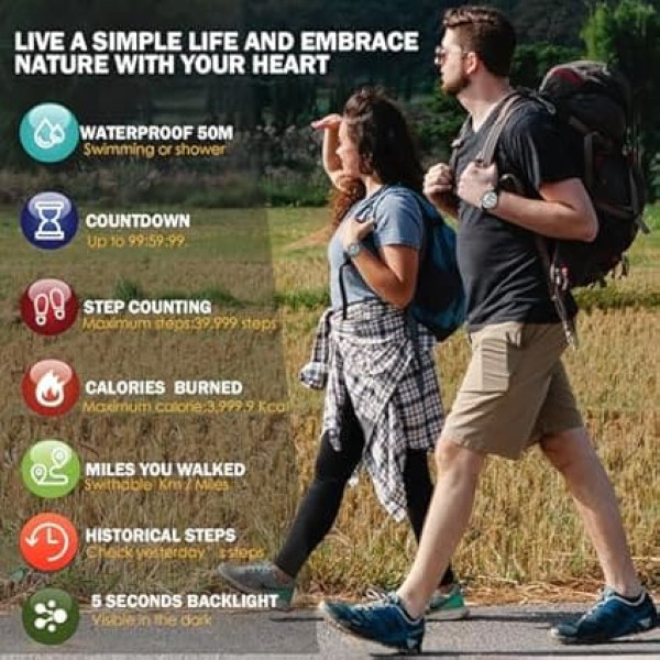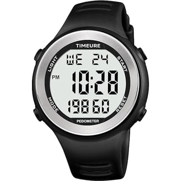 Get fit with an independent pedometer watch: This independent fitness watch does not require an app or smartphone connection. It is the perfect choice for those looking for a simple and self-sufficient way to track their fitness. Premium design: Made with an elegant stainless steel ring and a soft, comfortable PU strap. Our pedometer watch is thoughtfully designed to provide a cozy fit for wrist sizes from 160mm to 240mm 【The ultimate gift for fitness enthusiasts and seniors】Lightweight and comfortable, our pedometer watch is a fantastic gift for fitness enthusiasts and seniors alike. Its easy-to-use functionality makes it usable without the need for a smartphone. Illuminated comfort: Equipped with a large dial and LED backlight, our pedometer watch ensures effortless readability, even in dimly lit environments. Ideal for outdoor activities such as hiking, camping and swimming Immerse yourself in adventure: With its impressive water resistance of 50 m, this watch is suitable for washing hands and swimming. It offers a range of practical functions including time, date, week display, alarm, hourly chime, pedometer, calorie counter, stopwatch and countdown timer. › See more product details
