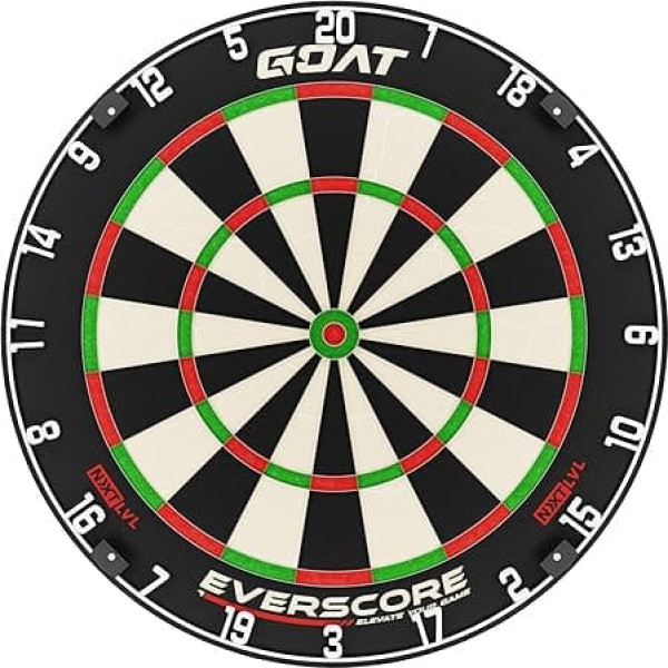 MASTERFUL DESIGN The GOAT Everscore NXT LVL Dartboard is a true work of art that demonstrates masterful design. Every detail has been carefully considered, resulting in a minimalist, modern and visually appealing board. Whether in the living room, man cave or office, this dartboard is not only functional but also adds a touch of style to any environment. Sisal: The dartboard is made of m sisal, which is sourced directly from Madagascar. This not only ensures an authentic dart experience, but also makes the board self-healing. The natural properties of sisal ensure that the holes created when playing darts effortlessly repair themselves, so that your dartboard is always ready for new challenges. SELF HEALING SISIAL: Thanks to the self-healing properties of sisal, the dartboard remains in optimal condition even after repeated use. The durability of the material guarantees a long service life, so that the dart players enjoy consistent performance and less worry about wear and tear. Tighter playing surface: the thoughtful design of the Everscore NXT LVL dartboard ensures a tight playing surface. The fine wiring minimizes bounce-outs, which keeps frustration to a minimum. So you can focus on perfecting your throws without being distracted by unnecessary interruptions. SUITABLE FOR ALL PLAYERS Whether you are a beginner mastering the basics or an experienced professional striving for perfection, the GOAT Everscore NXT LVL dartboard is suitable for all levels of play and experience. It offers a challenging but accessible gaming experience for all. › See more product details; Product description Product information: GOAT Everscore NXT LVL professional dartboard. Discover the GOAT Everscore NXT LVL dartboard, a true masterpiece that will take your dart game to a new level! This dartboard combines top quality with a minimalist design for an unparalleled gaming experience. High-quality sisal. The GOAT Everscore NXT LVL dartboard is made from high-quality sisal covered from Madagascar. This not only ensures an authentic dart experience, but also makes the board self-healing. The natural properties of sisal ensure that the holes created when playing darts effortlessly repair themselves, so that your dartboard is always ready for new challenges. Minimalist design The design of the Everscore NXT LVL dartboard is a feast for the eyes. With a minimalist approach, every detail has been carefully considered, resulting in an elegant and modern design. Whether in the living room, man cave or office, this dartboard adds a touch of style to any setting. Spacious playing surface. Thanks to the high-quality sisal and thoughtful design, this dartboard offers an exceptional playing surface. The fine wiring minimizes bounce off, so you can focus on the perfect cast. Whether you are a beginner or an experienced professional, the GOAT Everscore NXT LVL dartboard guarantees hours of darting fun. [[VIDEO]] [VIDEO]] [[VIDEO]] Remove the number ring of your dartboard at regular intervals and turn the complete plate clockwise by a few segments [[VIDEO]] [VIDEO]]; Product description Product information: GOAT Everscore NXT LVL professional dartboard. Discover the GOAT Everscore NXT LVL dartboard, a true masterpiece that will take your dart game to a new level! This dartboard combines top quality with a minimalist design for an unparalleled gaming experience. High-quality sisal. The GOAT Everscore NXT LVL dartboard is made from high-quality sisal covered from Madagascar. This not only ensures an authentic dart experience, but also makes the board self-healing. The natural properties of sisal ensure that the holes created when playing darts effortlessly repair themselves, so that your dartboard is always ready for new challenges. Minimalist design The design of the Everscore NXT LVL dartboard is a feast for the eyes. With a minimalist approach, every detail has been carefully considered, resulting in an elegant and modern design. Whether in the living room, man cave or office, this dartboard adds a touch of style to any setting. Spacious playing surface. Thanks to the high-quality sisal and thoughtful design, this dartboard offers an exceptional playing surface. The fine wiring minimizes bounce off, so you can focus on the perfect cast. Whether you are a beginner or an experienced professional, the GOAT Everscore NXT LVL dartboard guarantees hours of darting fun. [[VIDEO]] [VIDEO]] [[VIDEO]] Remove the number ring of your dartboard at regular intervals and turn the complete plate clockwise by a few segments [[VIDEO]] [VIDEO]]; Product information: GOAT Everscore NXT LVL professional dartboard. Discover the GOAT Everscore NXT LVL dartboard, a true masterpiece that will take your dart game to a new level! This dartboard combines top quality with a minimalist design for an unparalleled gaming experience. High-quality sisal. The GOAT Everscore NXT LVL dartboard is made from high-quality sisal covered from Madagascar. This not only ensures an authentic dart experience, but also makes the board self-healing. The natural properties of sisal ensure that the holes created when playing darts effortlessly repair themselves, so that your dartboard is always ready for new challenges. Minimalist design The design of the Everscore NXT LVL dartboard is a feast for the eyes. With a minimalist approach, every detail has been carefully considered, resulting in an elegant and modern design. Whether in the living room, man cave or office, this dartboard adds a touch of style to any setting. Spacious playing surface. Thanks to the high-quality sisal and thoughtful design, this dartboard offers an exceptional playing surface. The fine wiring minimizes bounce off, so you can focus on the perfect cast. Whether you are a beginner or an experienced professional, the GOAT Everscore NXT LVL dartboard guarantees hours of darting fun. [[VIDEO]] [VIDEO]] [[VIDEO]] Remove the number ring of your dartboard at regular intervals and turn the complete plate c