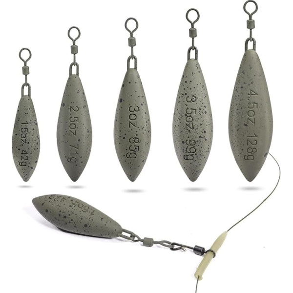 NON-TOXIC AND HARMFUL Sougayilang carp fishing weights are made of rust-proof and durable environmentally friendly materials, which can be used for a long time and not easily deformed and cracked when falling on stones. They are non-toxic, harmless and tailor-made for the European market, so they can be used when fishing with confidence. How to choose: Style 1 - 5 pieces: these flat round carp weights are suitable for close bait, easy to sink and make the weights very stable. Style 2 - 5pcs: hollow carp weights absorb the particle bait and release them slowly into the water. Style 3 - 5 pieces: long oval weights for long throwing fishing. 5 pieces/set: the weight is 42g/1.5oz, 71g/2.5oz, 85g/3oz, 99g/3.5oz, 128g/4.5oz. The choice of carp weights can affect throwing and holding at the bottom of the water. Choose the carp fishing weights that are easy to handle and simple in design. This gives you the flexibility to make long casts and quick lowers with minimal noise. BENEFITS All carp weights have a matte finish that does not reflect light like traditional coated weights, making the fish less suspicious. Oversized swivel, quickly attach various fishing hooks, suitable for all carp and match fishing needs. ONE YEAR WARRANTY --- We are proud to present you the worry-free one-year warranty! If there are any problems, please do not hesitate to contact us, and our customer service team will solve the problem for you as best as possible. › See more product details; Product description Oval design reduces drag and sinks quickly for long casts. 360 degree rotating copper ring, better load capacity.; Product description Oval design reduces drag and sinks quickly for long casts. 360 degree rotating copper ring, better load capacity.; Oval design reduces drag and sinks quickly for long casts. 360 degree rotating copper ring, better load capacity.