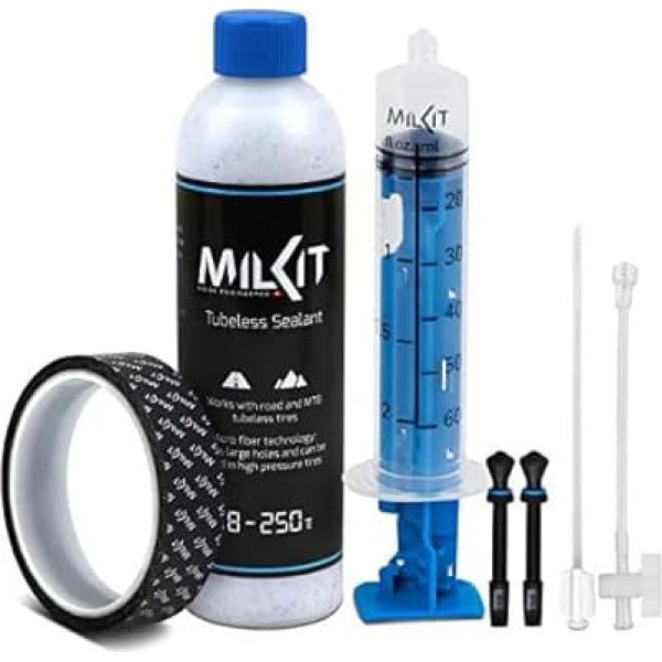 Easy conversion: the high-quality rim tape first ensures an airtight rim bed. With the help of the patented milKit valves, converting to tubeless wheels becomes a self-going. Simply insert valves, install the tyre, inflate and finally add the high-quality milKit sealing milk. Thanks to the patented valves, the valve heart can be removed without air loss and the tubeless sealant can be filled. Easy maintenance and filling thanks to the measuring and refill syringe: thanks to the syringe, the sealant can be injected exactly into the tyre to the millilitre. In addition, you save a lot of time refilling sealing milk, as the old tubeless milk can be sucked out of the tyre and new ones can be easily added - without releasing the pressure from the tyre or removing it. Compatible with most common rims: Our tubeless mounting kit is suitable for most rims, both carbon and aluminium rims. The milKit conversion kits differ only in the width of the rim tape. Before selecting the tubeless setup kit, the inner rim width of the rim must be observed to choose the right set. In addition, the tubeless valves included are 45 mm long on all sets. Should the rim height vary greatly, both shorter and longer valves (35 - 75 mm) are available. The set is generally suitable for roads, gravel and MTB tubeless wheels. Extensive conversion and repair kit: the tubeless kit contains 2 x 45 mm milKit valves, 1 x measuring and refill syringe, 1 x additional needle for filling the syringe, 1 x milKit sealing milk 250 ml, 10 m long tubeless rim tape (width depends on set selection), 1 x valve heart tool, 2 x milKit rim stickers, 1 x instruction manual (English language not guaranteed). milKit Makes your tubeless life easier: discover many other innovative products from milKit, such as the award-winning tubeless tyre sealant (test winner in mountain bike magazine) or the unique milKit tubeless booster, which can also be used as a water bottle. The booster is the lightest and most efficient inflation aid and especially suitable for bikers who do not have a portable compressor. › See more product details