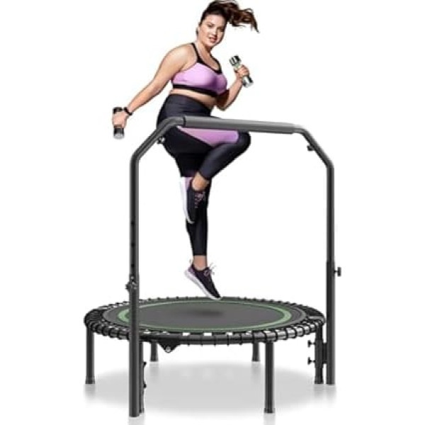 Load capacity of 150 kg: this fitness trampoline with its sturdy, thickened steel frame and reinforced legs supports up to 330 lbs (150 kg) and provides a stable and safe jumping experience. The non-slip foot pads ensure low noise and protect your floor, so you can jump safely without disturbing others. HIGH STRENGTH RUBBER CORDS Enjoy a smooth and gentle bounce with our high strength shock cords designed for lasting elasticity. They absorb most vibrations and thus protect your knees, joints and back. 4 LEVEL ADJUSTABLE HEIGHT Achieve the perfect jump height with the mini trampoline's 4-level adjustable handle, which ranges from 39 to 48.5 inches. Adjust the height to your comfort level and maximise your training performance. FOLDABLE DESIGN Effortlessly save space with the foldable design of the indoor trampoline. It can be reduced to 80% of its original size, making storage a breeze. Whether under the bed, sofa, in the corner or even in the boot of your car, this trampoline can be easily stored when not in use. Easy installation: jump off in no time! The fitness trampoline comes partially pre-assembled and with the included labor-saving tool, you can fully set it up and ready to use in just 10 minutes. › See more product details