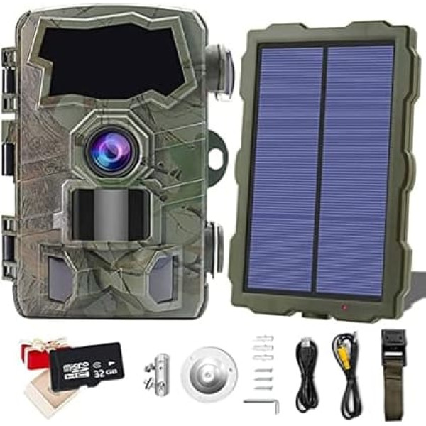 Wi-Fi connection and app control: With the built-in WiFi and Bluetooth, you can connect to the Wi-Fi trail camera remotely and manage memory, preview pictures and videos immediately. Watch live videos from your app. The connection of the WiFi has a distance limit of about 32 feet. Simply download the free and user-friendly app \; Product description The 32MP 4K WiFi Trail Camera Starlight Night Vision Game Wildlife Hunting Camera has a WiFi module that can transfer photos and videos to your smartphone from a distance of 30 metres, so you can adjust the camera settings remotely. It also delivers peak performance with 32MP photo resolution and 4K HD video with sound. Camera specification: Photo resolution - 32 MP. Video resolution - 3840 x 2160. The distance of night vision - 65 ft (20 m) distance. Detection angle: 120°. Size: 5.4 x 3.5 x 3.0 inches. Item weight: 9.28 oz. Solar panel specifications: Input voltage: DC 5 V. Output Voltage - DC 6V/1.5A Power cord connection - 3.5 x 1.35 x 10mm Waterproof - IP56 splash-proof. Operating temperature: -4°F to +122°F. Warm tips: 1. Before using this outdoor wildlife camera, please format the memory card. Recommend using a micro SD card up to 512GB. 2. Please remove the protective films from the camera lens, infrared lamp lens and PIR sensor so as not to affect the camera effect. 3. Please select \; Product description The 32MP 4K WiFi Trail Camera Starlight Night Vision Game Wildlife Hunting Camera has a WiFi module that can transfer photos and videos to your smartphone from a distance of 30 metres, so you can adjust the camera settings remotely. It also delivers peak performance with 32MP photo resolution and 4K HD video with sound. Camera specification: Photo resolution - 32 MP. Video resolution - 3840 x 2160. The distance of night vision - 65 ft (20 m) distance. Detection angle: 120°. Size: 5.4 x 3.5 x 3.0 inches. Item weight: 9.28 oz. Solar panel specifications: Input voltage: DC 5 V. Output Voltage - DC 6V/1.5A Power cord connection - 3.5 x 1.35 x 10mm Waterproof - IP56 splash-proof. Operating temperature: -4°F to +122°F. Warm tips: 1. Before using this outdoor wildlife camera, please format the memory card. Recommend using a micro SD card up to 512GB. 2. Please remove the protective films from the camera lens, infrared lamp lens and PIR sensor so as not to affect the camera effect. 3. Please select \; The 32MP 4K WiFi Trail Camera Starlight Night Vision Game Wildlife Hunting Camera has a WiFi module that can transfer photos and videos to your smartphone from a distance of 30 metres, so you can adjust the camera settings remotely. It also delivers peak performance with 32MP photo resolution and 4K HD video with sound. Camera specification: Photo resolution - 32 MP. Video resolution - 3840 x 2160. The distance of night vision - 65 ft (20 m) distance. Detection angle: 120°. Size: 5.4 x 3.5 x 3.0 inches. Item weight: 9.28 oz. Solar panel specifications: Input voltage: DC 5 V. Output Voltage - DC 6V/1.5A Power cord connection - 3.5 x 1.35 x 10mm Waterproof - IP56 splash-proof. Operating temperature: -4°F to +122°F. Warm tips: 1. Before using this outdoor wildlife camera, please format the memory card. Recommend using a micro SD card up to 512GB. 2. Please remove the protective films from the camera lens, infrared lamp lens and PIR sensor so as not to affect the camera effect. 3. Please select \