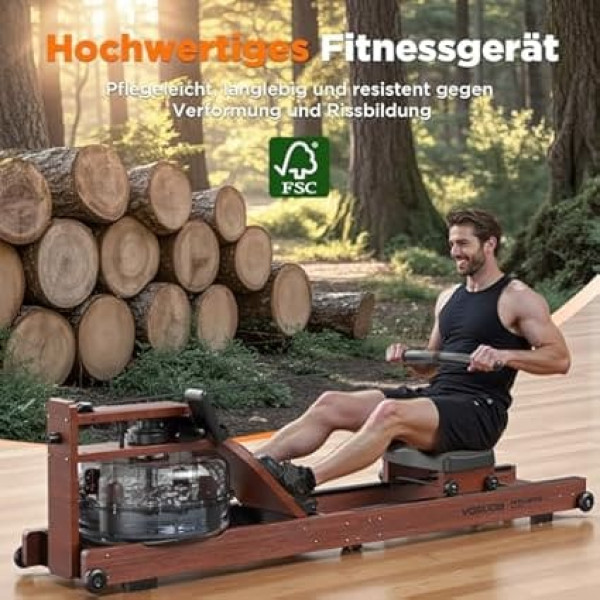 FSC certified beech wood: The home rowing machine is made of FSC certified beech wood, which is environmentally friendly and robust and can support a weight of up to 182 kg. Beech wood has a high density and is extremely pressure resistant, which ensures long-term safety and reliability and provides you with lasting support during training. SAFE & AUTHENTIC ROWING EXPERIENCE The double rail support structure combined with non-slip pads ensures stability and prevents wobbling during exercise. The closed water resistance system prevents leaks and provides additional safety. By adding or reducing the amount of water, the resistance can be adjusted to allow different training intensities. Space Saving Folding & Easy Assembly Design The rowing machine can be folded, reducing the volume by 50%. Our wooden rowing machine is 98% pre-assembled so you have it ready to use in just 10 minutes. In addition, we offer two year replacement parts warranty for your safety and satisfaction. Real-time data tracking: The display shows real-time data such as distance, time and calories. With Bluetooth support, you can connect to popular fitness apps to record your training history and support scientifically sound training. HIGHLY EFFICIENT FULL BODY WORKOUT It trains 84% of muscle groups and burns fat twice as efficiently as running. The joint-friendly low-impact design is ideal for burning fat, body shaping and strengthening the heart-lung function, so it meets the fitness needs of the whole family. › See more product details