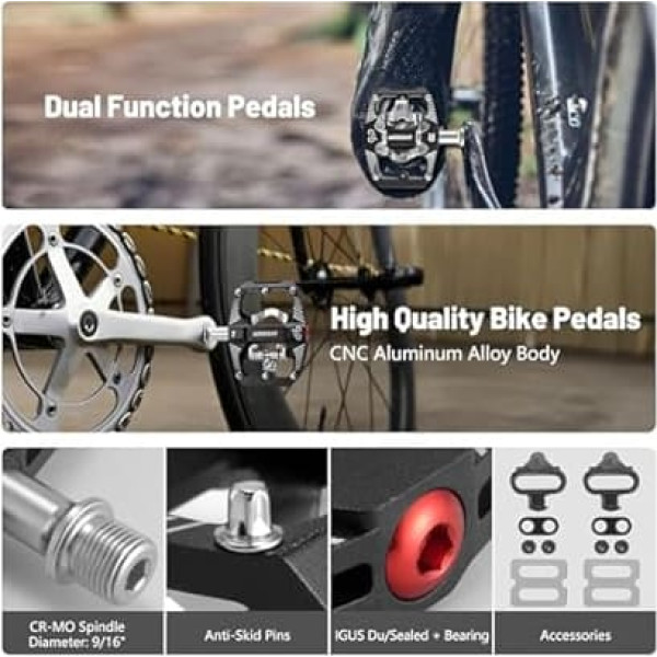 Advanced bicycle pedals --- The upgraded, high-quality construction and absolute durability of the Lycaon bicycle pedals. These pedals are made from CNC processed aluminium, which provides a lightweight yet robust structure. The CNC processed body gives you 100% safety. The size of the pedal platform is: 3.54 x 4.13 inches. Stability and support: thanks to our innovative pedal construction, you can achieve unparalleled stability and grip while driving. These pedals feature a wider platform that provides excellent stability and improves your entire riding experience. The non-slip design ensures enough grip and control even in wet conditions, so you feel comfortable and safe on every ride. IGUS DU/SEALED + BEARING --- Sealed bearings for bicycle pedals that protect the shaft from water and dust and avoid the formation of noise and other problems. So you can ride in the rain or climb mountains. In addition, the CR-MO shaft has a diameter of 9/16 inches. They are suitable for both beginners and professional bicycle lovers. Double-sided design and easy to install: this bicycle pedal features a traditional platform on one side and a click pedal design for getting in, which provides versatility for different riding styles. For use with click cycling shoes or regular street shoes with gaskets. 6 stainless steel anti-slip pins keep your feet securely in place (6 on one side, 4 on the other). Thanks to the anti-slip design and clear markings, installation is easy. The markings \; Product description Discover the latest advances in bicycle pedals with our LYCAON bike pedals. These pedals offer an upgraded, high-quality construction and absolute durability that will provide you with a safe and comfortable riding experience, whether you are a beginner or a professional bike lover.​ High-quality construction made of CNC processed aluminium​ Our LYCAON bicycle pedals are made of high quality CNC processed aluminum. This material provides a lightweight yet extremely robust structure. The CNC processing ensures precise manufacturing that makes the pedals a reliable and durable part of your bike. With a size of the pedal platform of 3.54 x 4.13 inches, our pedals provide sufficient footwell and grip to improve your driving performance. IGUS DU/SEALED + bearing: protection device for consistent performance The sealed bearings of our LYCAON bicycle pedals are a real highlight. The IGUS DU/SEALED + bearings effectively protect the shaft from water and dust, which avoids the formation of annoying noise and other problems. So you can easily ride in the rain or climb demanding mountains without worrying about damage to your pedals. With a 9/16 inch diameter CR-MO axle, you are well equipped with our pedals, whether you are driving on uneven terrain or on demanding tracks. Double sided design The double-sided design of our LYCAON bicycle pedals offers you maximum flexibility. On the one hand, you will find a traditional platform that is perfect for normal rides with ordinary street shoes. The other side of the pedal is suitable for click pedal cycling shoes (washers included). With this design, you can switch between different riding styles depending on what suits you best. The 6 stainless steel anti-slip pins (6 on one side, 4 on the other) keep your feet securely in place, even in demanding driving conditions.​; Product description Discover the latest advances in bicycle pedals with our LYCAON bike pedals. These pedals offer an upgraded, high-quality construction and absolute durability that will provide you with a safe and comfortable riding experience, whether you are a beginner or a professional bike lover.​ High-quality construction made of CNC processed aluminium​ Our LYCAON bicycle pedals are made of high quality CNC processed aluminum. This material provides a lightweight yet extremely robust structure. The CNC processing ensures precise manufacturing that makes the pedals a reliable and durable part of your bike. With a size of the pedal platform of 3.54 x 4.13 inches, our pedals provide sufficient footwell and grip to improve your driving performance. IGUS DU/SEALED + bearing: protection device for consistent performance The sealed bearings of our LYCAON bicycle pedals are a real highlight. The IGUS DU/SEALED + bearings effectively protect the shaft from water and dust, which avoids the formation of annoying noise and other problems. So you can easily ride in the rain or climb demanding mountains without worrying about damage to your pedals. With a 9/16 inch diameter CR-MO axle, you are well equipped with our pedals, whether you are driving on uneven terrain or on demanding tracks. Double sided design The double-sided design of our LYCAON bicycle pedals offers you maximum flexibility. On the one hand, you will find a traditional platform that is perfect for normal rides with ordinary street shoes. The other side of the pedal is suitable for click pedal cycling shoes (washers included). With this design, you can switch between different riding styles depending on what suits you best. The 6 stainless steel anti-slip pins (6 on one side, 4 on the other) keep your feet securely in place, even in demanding driving conditions.​; Discover the latest advances in bicycle pedals with our LYCAON bike pedals. These pedals offer an upgraded, high-quality construction and absolute durability that will provide you with a safe and comfortable riding experience, whether you are a beginner or a professional bike lover.​ High-quality construction made of CNC processed aluminium​ Our LYCAON bicycle pedals are made of high quality CNC processed aluminum. This material provides a lightweight yet extremely robust structure. The CNC processing ensures precise manufacturing that makes the pedals a reliable and durable part of your bike. With a size of the pedal platform of 3.54 x 4.13 inches, our pedals provide sufficient footwell and grip to improve your driving performance. IGUS DU/SEALED + bearing: protecti
