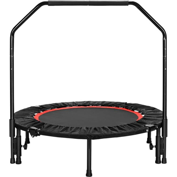 High load capacity and good elasticity: 32 reinforced high-performance springs + high-quality steel frame + PP jumping mat + PVC Oxford fabric guarantee our trampoline outstanding elasticity and maximum stability with a maximum load capacity of 150 kg. Enjoy safe, comfortable jumping for effective training with maximum safety. Trampoline with handle: This fitness trampoline with U-shaped, height-adjustable handle makes training particularly beginner-friendly. As the handle can be removed, it adapts to different training intensities - at the same time it remains space-saving and easy to move. Robust and stable bracket: 6 thickened steel leg tubes, equipped with non-slip foot pads on the bottom, increase the stability of the trampoline, reduce displacement due to friction with the ground when jumping, improve safety and protect your floor at the same time. Small trampoline, space-saving: This compact indoor trampoline measures only 101 x 101 x 26 cm (L x W x H) when assembled and takes up less than 1.5 m² of floor space. Perfect for small apartments - it easily finds space in a corner of your living room, bedroom or even next to the desk! After dismantling the handle, the height is only 26 cm, so you can store it under the bed or sofa to save space. With a lightweight of only 11.4 kg, even women can move it effortlessly Easy to install: As the springs of the trampoline are already pre-assembled, the time-consuming assembly is eliminated. After receipt, two people can unfold the frame and assemble all other components within 20 minutes - start effective gymnastics trampoline training immediately Note: As this is a fitness trampoline with steel springs, it is inevitable to jump noise during use. Users with high demands on low noise should keep this in mind. Due to the construction, there may be slight movement of the handle supports but these are securely attached and do not come loose - please use it worry-free. › See more product details