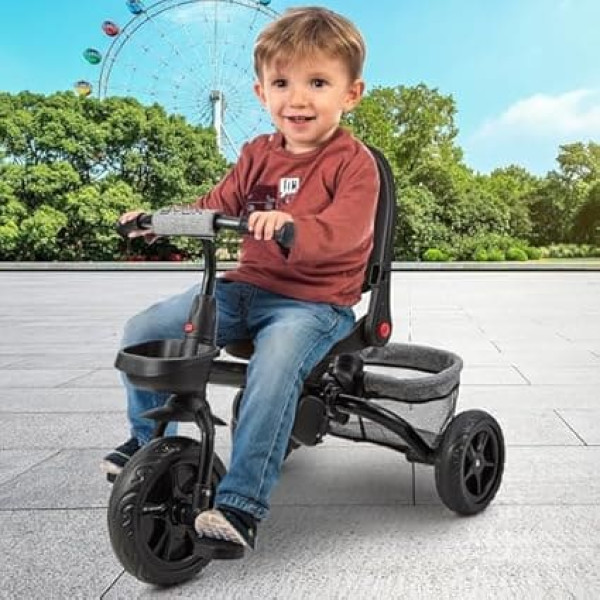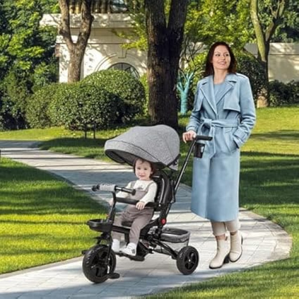 Tricycle from 1 year old with push bar - This tricycle with push bar grows with your child! It starts as a safe baby bike from 1 year, becomes a children's bike with pedals and finally transforms into a classic tricycle for children up to 5 years. Thanks to the removable hood, protective railing and push rod, it adapts perfectly. DURABLE & SAFE - IDEAL AS OUTDOOR TOYS - The sturdy carbon steel frame supports up to 30 kg, while the breathable fabrics ensure comfort. Perfect for little explorers as toys from 1 year old or tricycle. Functional & comfortable like a pushchair 6 in 1 - The foldable hood protects against sun and wind, the adjustable backrest ensures comfortable sitting. The 360° rotating seat allows eye contact with parents - ideal for a tricycle for 1-5 year old. MAXIMUM SAFETY FOR YOUR CHILD - With 3-point harnesses, removable handlebars, clutch, brake and non-slip EVA tyres. Whether as a slide car with push bar or active bicycle children - safety comes first Practical & space-saving - perfect for on the go - easy to assemble without screws, easy to fold and operate with one hand. Includes cup holder and large basket - ideal for trips as a handcart foldable children or tricycle with handlebar. › See more product details