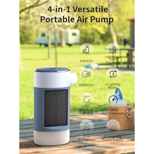 All-in-one air pump and camping lantern: Enjoy the convenience of a compact design that combines a powerful air pump and a versatile camping lantern in one device; this all-in-one solution eliminates the need to transport multiple items, making it an ideal companion for outdoor adventures Dual air modes for perfect inflation: this air pump has two inflation modes - strong and soft - so you can easily choose the right pressure for different inflatable items; whether you inflate air mattresses or toys, switch effortlessly between modes to meet your specific needs 3 adjustable light modes: experience adjustable lighting with three different modes: bright, medium and soft; this function provides flexible lighting options for different situations, whether you need bright light to set up your campsite or soft light for a cosy evening under the stars Solar charging capability: Improve your outdoor experience with the solar powered charging function; use the energy of the sun to charge the device and ensure you have a reliable power source during your camping trips, while minimising your carbon footprint Extended operating time: Benefit from impressive operating times that provide up to 12 hours of use at the lowest brightness level and about 2 hours at maximum brightness; this guarantees reliable lighting during your outdoor activities, especially in areas with limited access to electricity Variety of accessories for versatile applications: the air pump comes with different nozzles that are suitable for different applications, from inflating air mattresses and sports equipment to a reliable light source during camping trips; this versatility significantly improves your outdoor experience Lightweight and portable design: with only 210 g weight and compact dimensions of 46 x 50 x 146 mm, this air pump is easy to carry and makes it an indispensable gadget for camping, picnics and travel; its portability ensures that you can take it anywhere without adding extra weight to your equipment Reliable customer service: Committed to quality - from the moment you buy Kasonic products, you can contact us directly if you encounter any problems within the first 12 months to request spare parts; Kasonic attaches importance to your satisfaction and offers dedicated customer service to solve any problems quickly › See more product details; Product description K Kasonic Electric air pump with camping light; Product description K Kasonic Electric air pump with camping light; K Kasonic Electric air pump with camping light