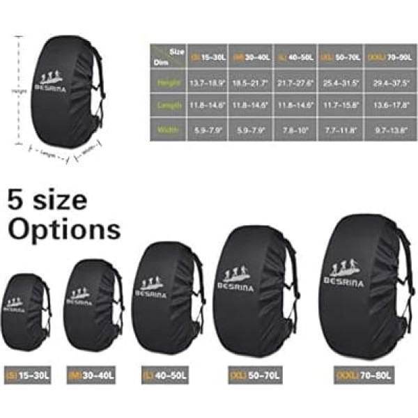 Besrina Rain Cover for Backpacks, Waterproof Backpack Cover (15-90L), Backpack Cover with Non-Slip Cross Straps and Reflectors for Hiking, Touring and Cycling