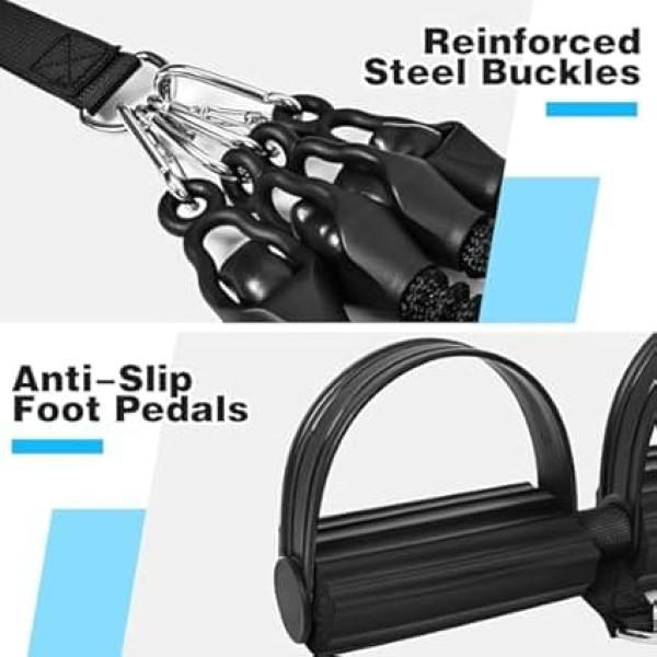 Full body workout for home - The training band is suitable for exercises for abdomen, legs, back, chest and arms, ideal for effective home training without equipment Adjustable resistance up to 100 lbs - individually usable rubber bands allow progressive strength training for beginners and advanced users Robust workmanship with steel carabiners – the sturdy metal carabiners and tear-resistant straps guarantee a secure hold during intensive training sessions Includes door anchor and foot pedal - easy installation for varied exercises on the door or on the floor for functional workout Easy to transport and space-saving: the training system can be quickly stored and is ideal for home, office or travel › See more product details
