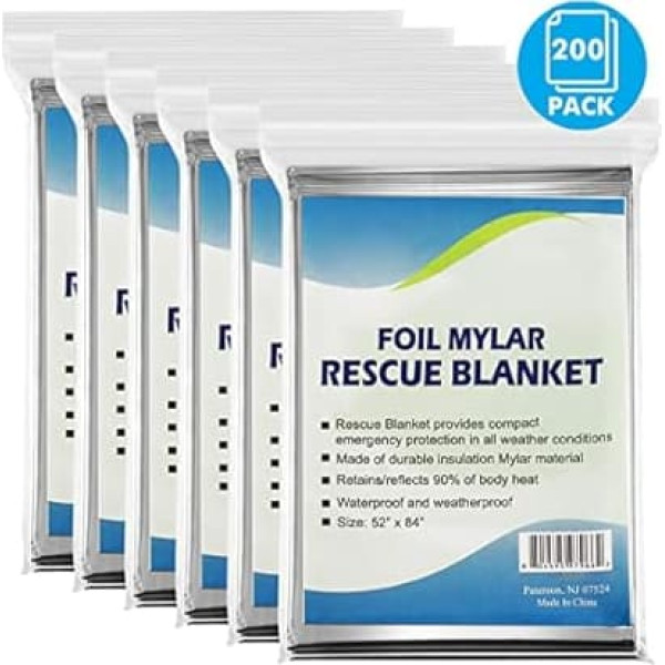 Emergency Sleeping Blanket - Used as emergency first aid supplies for survival and outdoor needs, it helps to stay warm, cozy and vibrant in extreme weather conditions. The blanket can be used as an emergency shelter or floor cover to protect against extreme wet conditions, rain, wind and snow hypothermia. Handy & Convenient 200 pack emergency mylar foil blankets, each blanket is individually folded, sealed and packaged for easy access and storage. DURABLE CONSTRUCTION - Made of waterproof, windproof, and waterproof foil mylar material, the blankets are ideal for insulating, regulating and retaining over 90% of your body heat. LIGHTWEIGHT & COMPACT The emergency blanket is the perfect size to cover your body and keep you safe and warm, but compact enough to easily carry and store in your backpack and travel bag. Item specifications: set includes 200 rescue blankets. Blanket measures 84\; Product description The perfect survival gear for emergencies, camping, extreme weather and cold weather conditions. It brilliantly retains 90% of your body heat to keep you warm and cosy even in frost. Waterproof and windproof to protect you from rain, snow, ice and strong winds.; Product description The perfect survival gear for emergencies, camping, extreme weather and cold weather conditions. It brilliantly retains 90% of your body heat to keep you warm and cosy even in frost. Waterproof and windproof to protect you from rain, snow, ice and strong winds.; The perfect survival gear for emergencies, camping, extreme weather and cold weather conditions. It brilliantly retains 90% of your body heat to keep you warm and cosy even in frost. Waterproof and windproof to protect you from rain, snow, ice and strong winds.