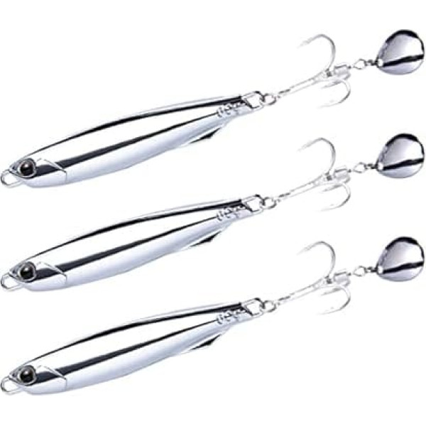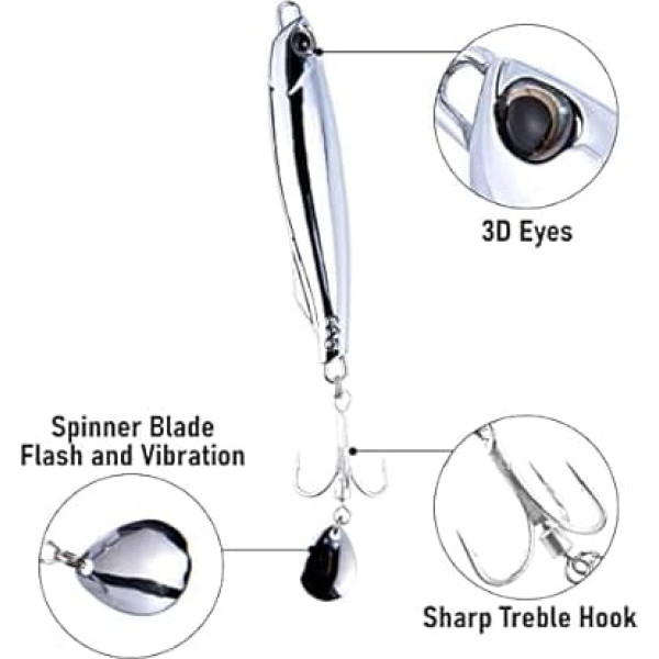 Fish-like profile: The fishing casting jig bait has a realistic fish-like shape, making it more attractive to fish and increasing the chances of a bite. Reflective coating: The jig bait has a highly reflective, mirror-like coating that flashes and shines in the water and attracts fish from a distance. TREBLE HOOKS Equipped with a treble hook, this jig bait is designed to provide a solid hook set to ensure the fish stays on the line once it takes a bite. CORROSION RESISTANT The zinc alloy coating of the jig bait makes it corrosion resistant to ensure it remains in good condition even after multiple uses in saltwater environments. SPINNER BLADE The treble hook is equipped with a spinner blade, which gives the bait extra flash and vibration, making it even more tempting for fish. › See more product details
