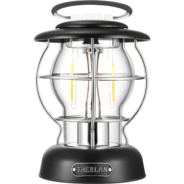 Therlan Camping Lamp, Retro Camping Lantern, (320 lm, IP44, 5000 mAh, up to 180 hours), 3 Brightness Light Modes, Continuously Dimmable Camping Lamp, Rechargeable Camping Lamp, Outdoor LED Camping