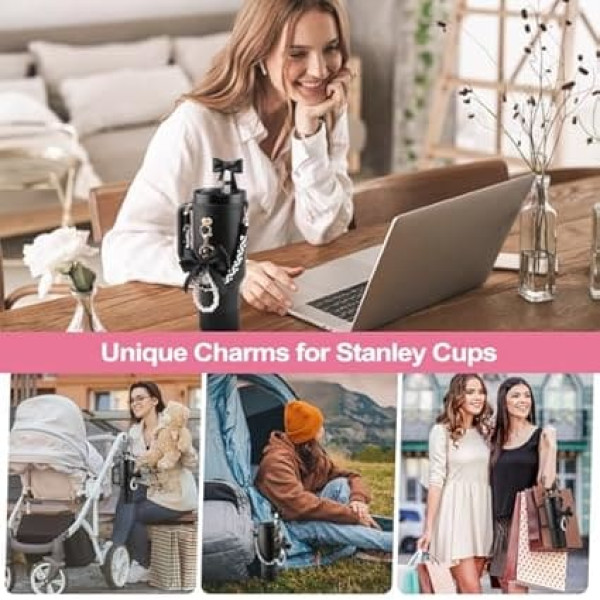 Stanley Cup Black Accessory Set Includes:1 x Water Bottle Handle, 1 x Bowknot Design Water Bottle Boots, 1 x Silicone Bow Straw Cover, 1 x Bow Keychain, 1 x Heart Hook. Please note: the product does not contain cups BOW DESIGN PROTECTIVE BOOTS - Because the diameter of the protective cover is 7.5 cm. It is compatible with Stanley mugs, simple modern tumblers, hydroflash wide mouth bottles and other lippy bottles. Our silicone boots for water bottle provide excellent protection against scratches, dents, bumps and slides, which helps to extend the life of your bottle while reducing noise ARCH STYLE This accessories set for Stanley Cup is customized to the festival theme and can personalize your Stanley mug, adding a strong Valentine's Day atmosphere while making your mug cute and funny. It can also be used as a photo prop to make your water cup a highlight at Valentine's Day parties. This is an excellent Valentine's Day gift for friends who like to decorate cups STYLISH DESIGN & EASY TO USE We have equipped the water cup with advanced silicone safety rings and flower and bead woven handle straps for easy carrying and safe use. Attention As it is made of silicone material, some stretching is required to fit the outer edge of the lid. The rubber around the bottle is very dense, which makes it very safe. Even if the cup is filled with water, you don't have to worry about the strap falling off or loosening Multifunctional: The bow straw cover is made of food-safe silicone material and is suitable for Stanley 30/1.134.0 g and other cups with 0.4 inch straws. Reusable, easy to clean, dustproof and decorative. In addition, the accessories for Stanley Cup can be placed on the cup holder of the vehicle or used anywhere, especially at work, hiking, camping, travel, gatherings, sports and outdoor activities › See more product details; Product description Black Accessory Set for Stanley Tumbler, Water Bottle Handle, Silicone Boots, Bow Straw Cover, Bead Charms, Straw Attachment for 4 Gallon and 30 oz Tumbler for Women; Product description Black Accessory Set for Stanley Tumbler, Water Bottle Handle, Silicone Boots, Bow Straw Cover, Bead Charms, Straw Attachment for 4 Gallon and 30 oz Tumbler for Women; Black Accessory Set for Stanley Tumbler, Water Bottle Handle, Silicone Boots, Bow Straw Cover, Bead Charms, Straw Attachment for 4 Gallon and 30 oz Tumbler for Women